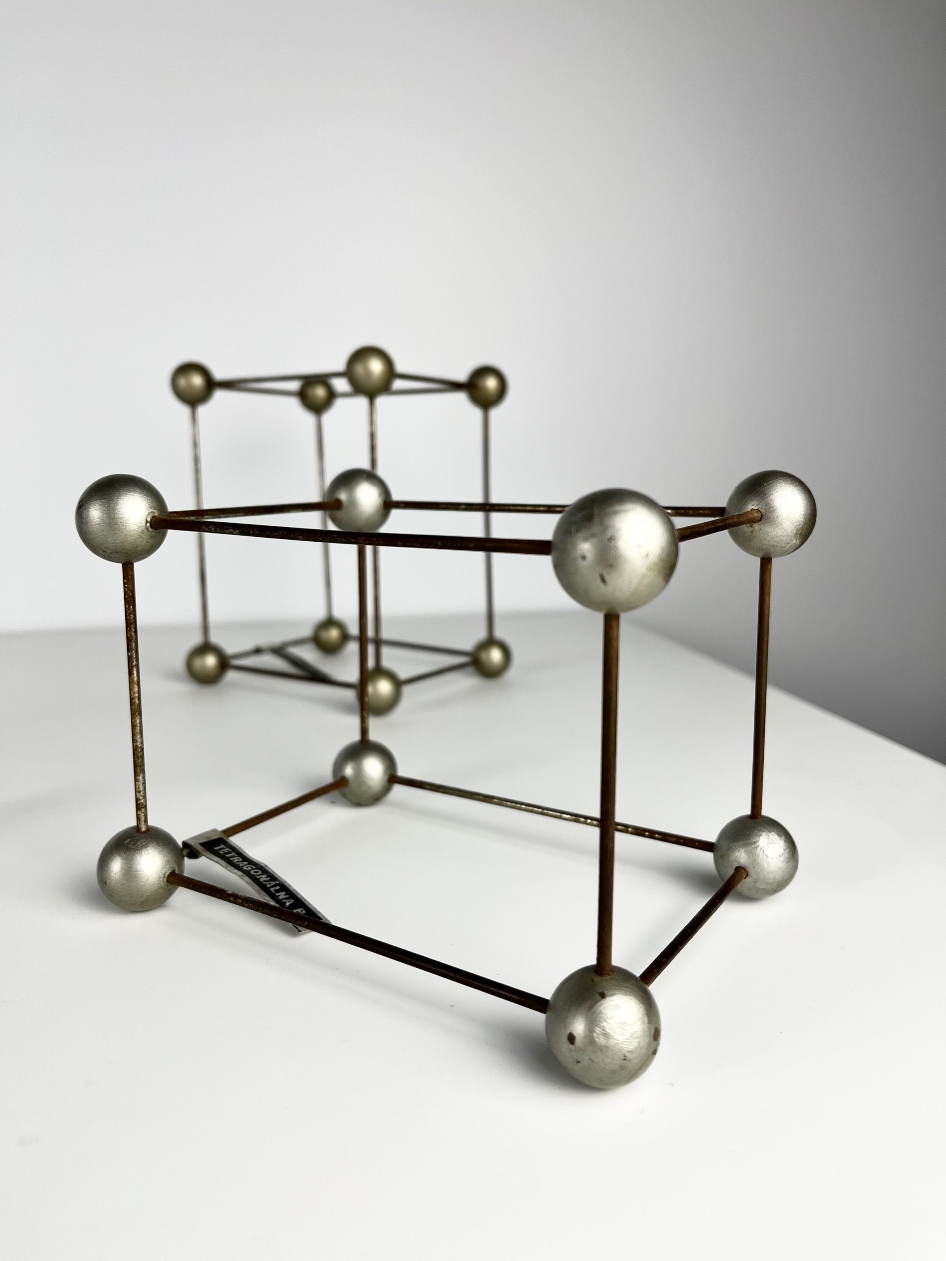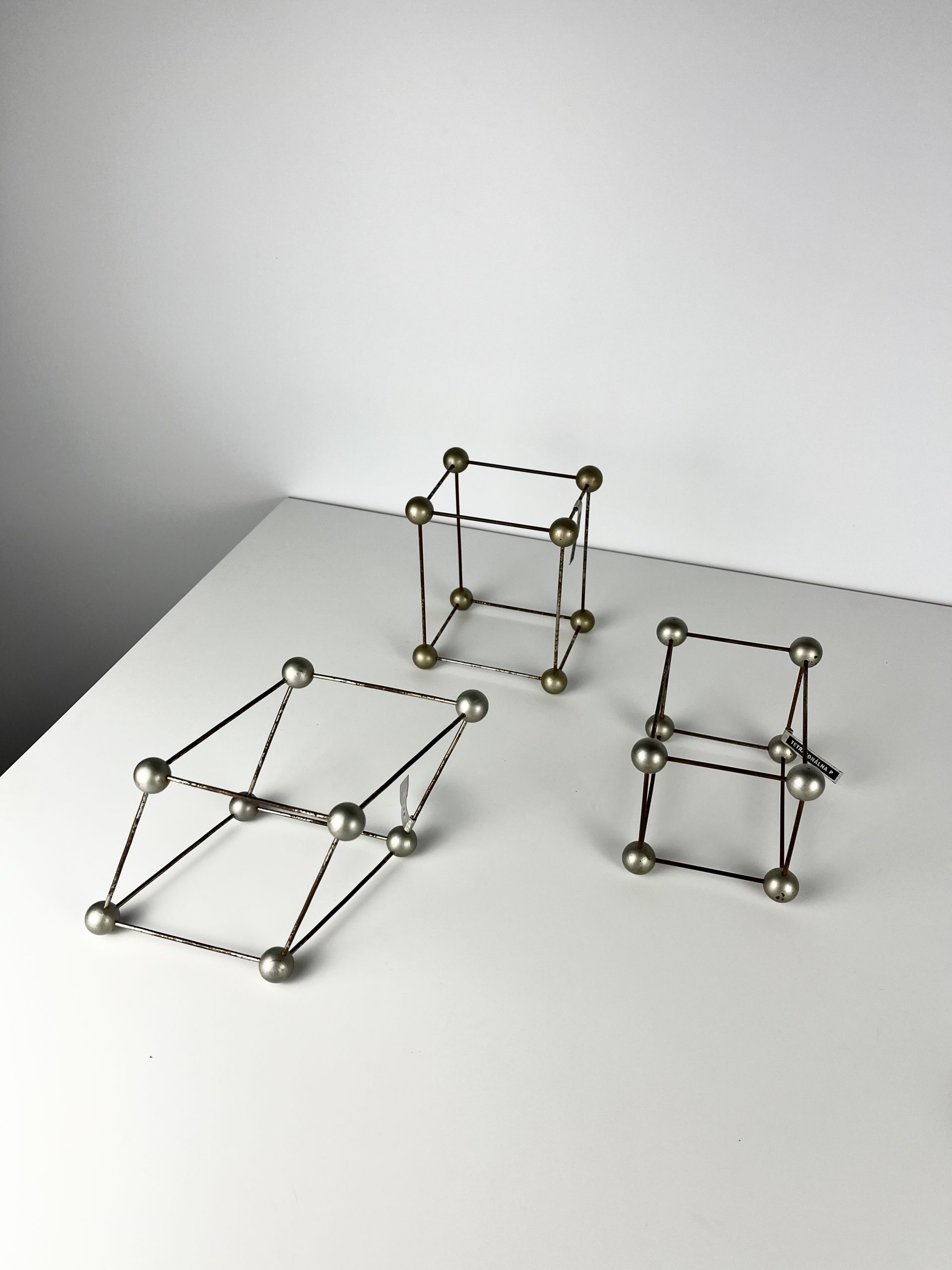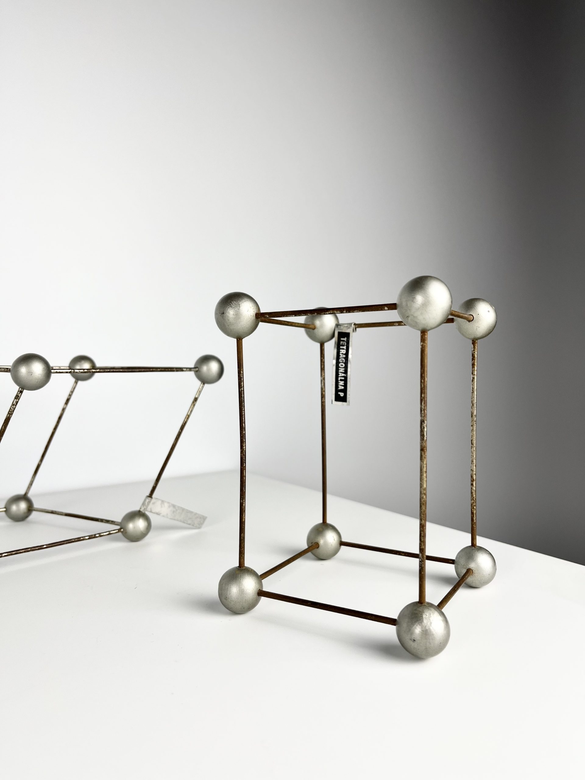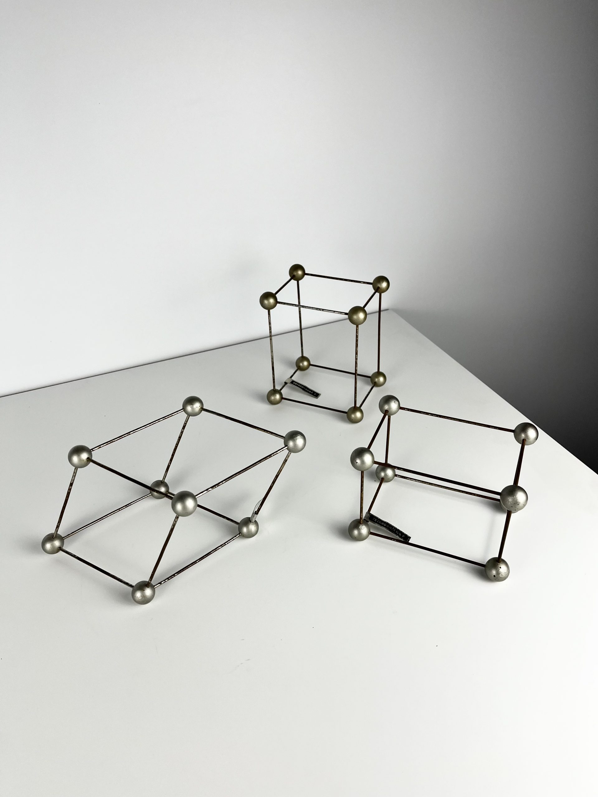 Designed as teaching aids to demonstrate microscopic crystal structures, they’re constructed from brushed metal spheres connected by steel rods.