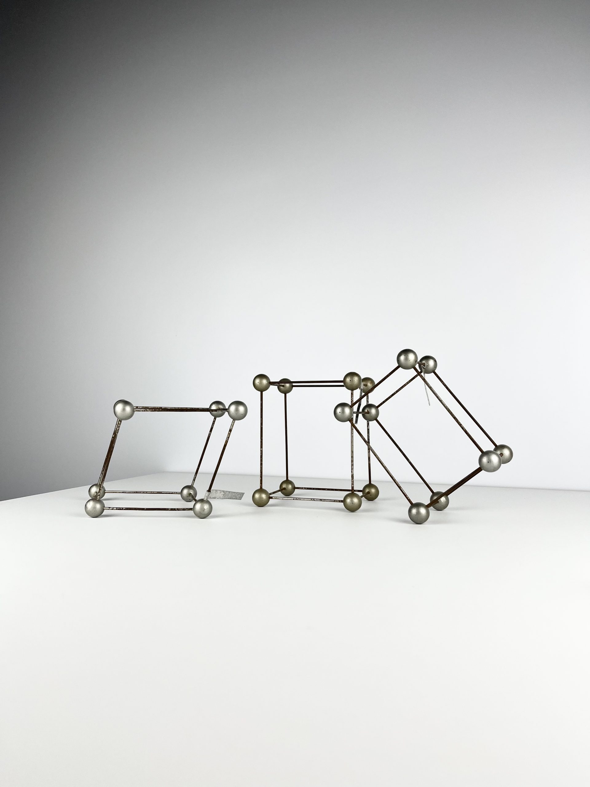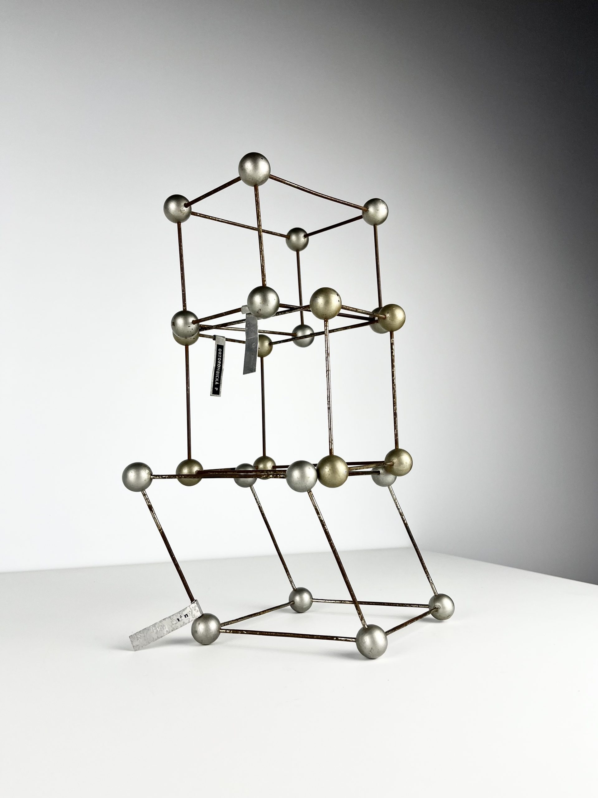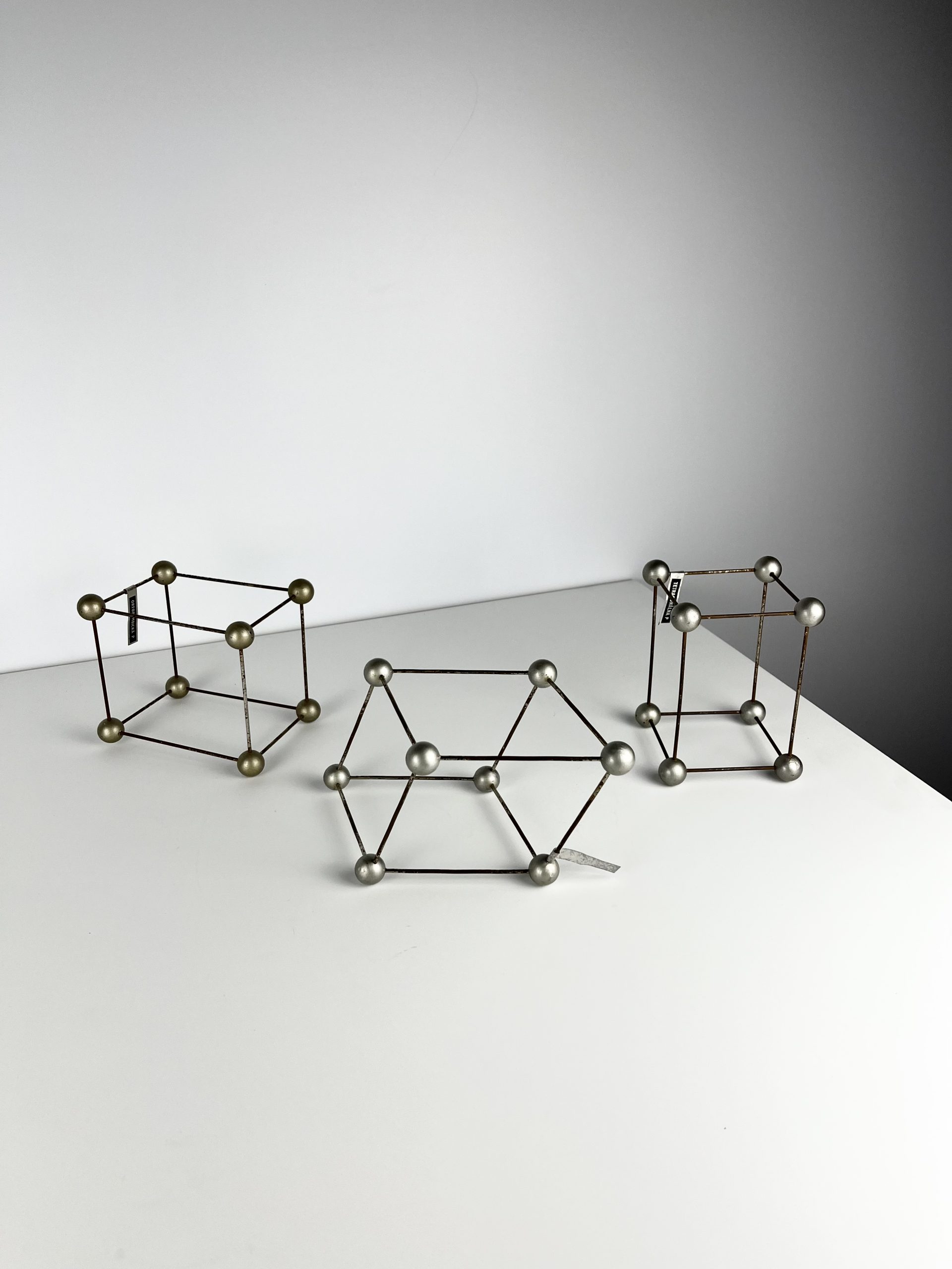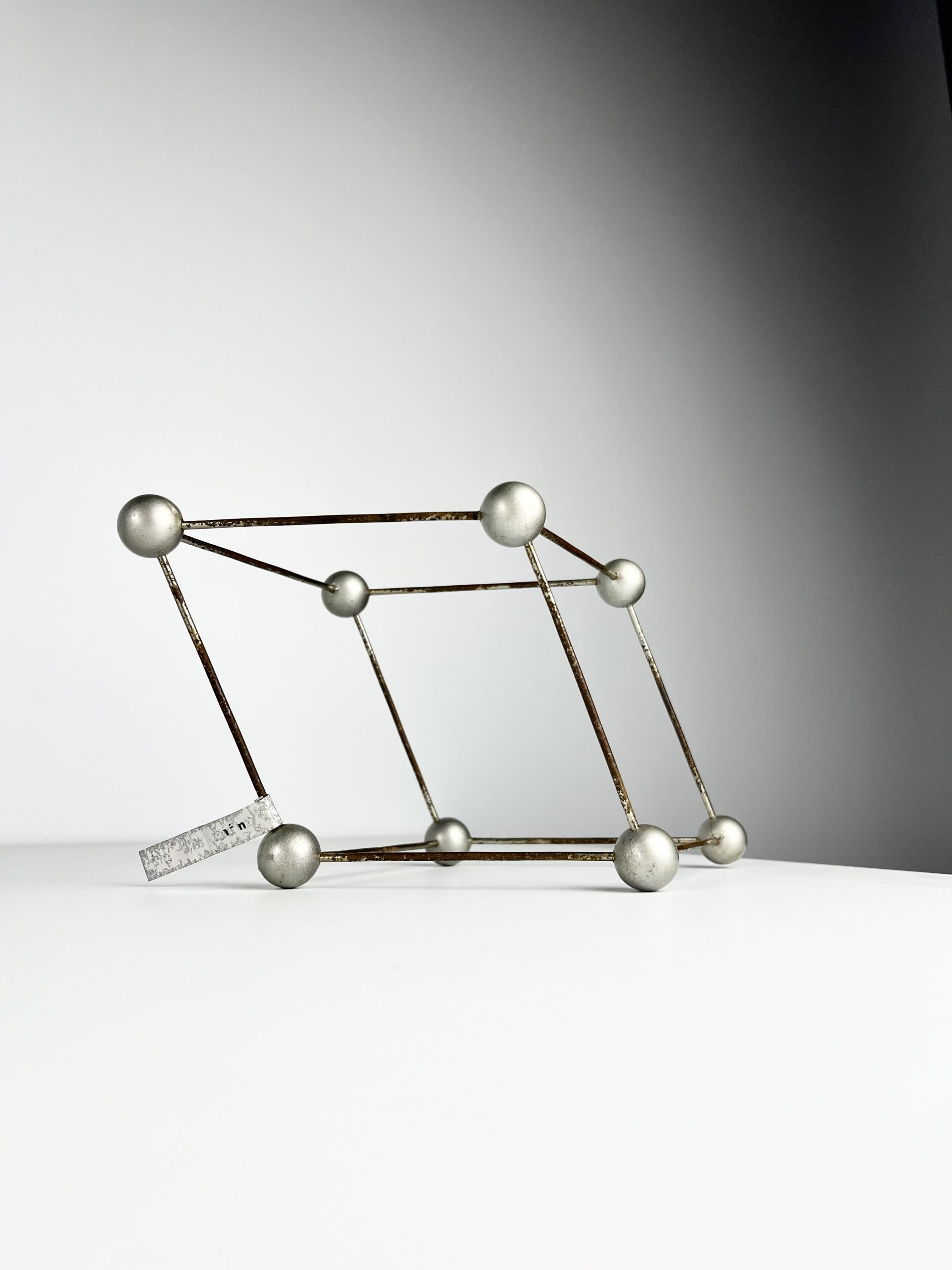 Designed as teaching aids to demonstrate microscopic crystal structures, they’re constructed from brushed metal spheres connected by steel rods.