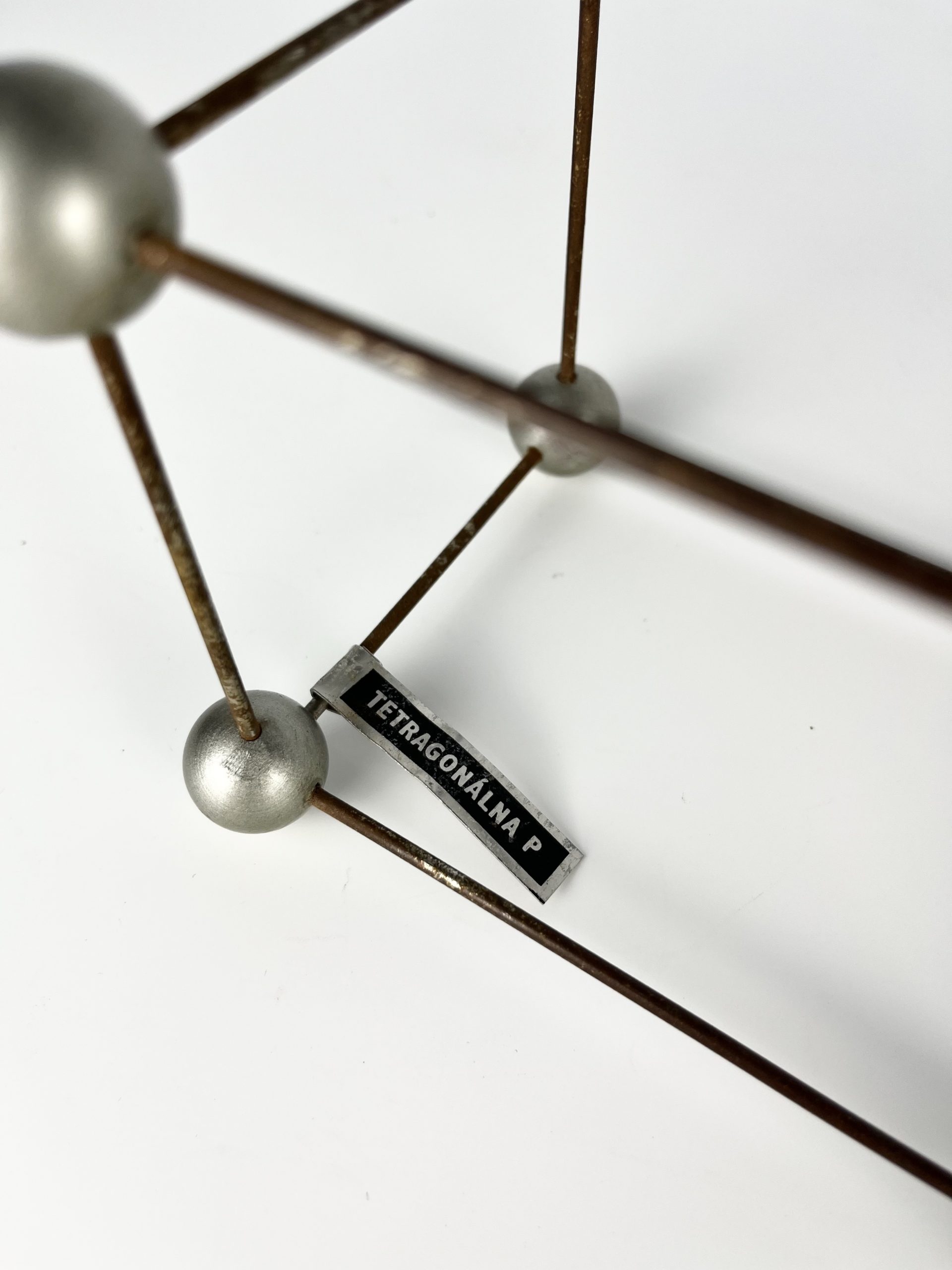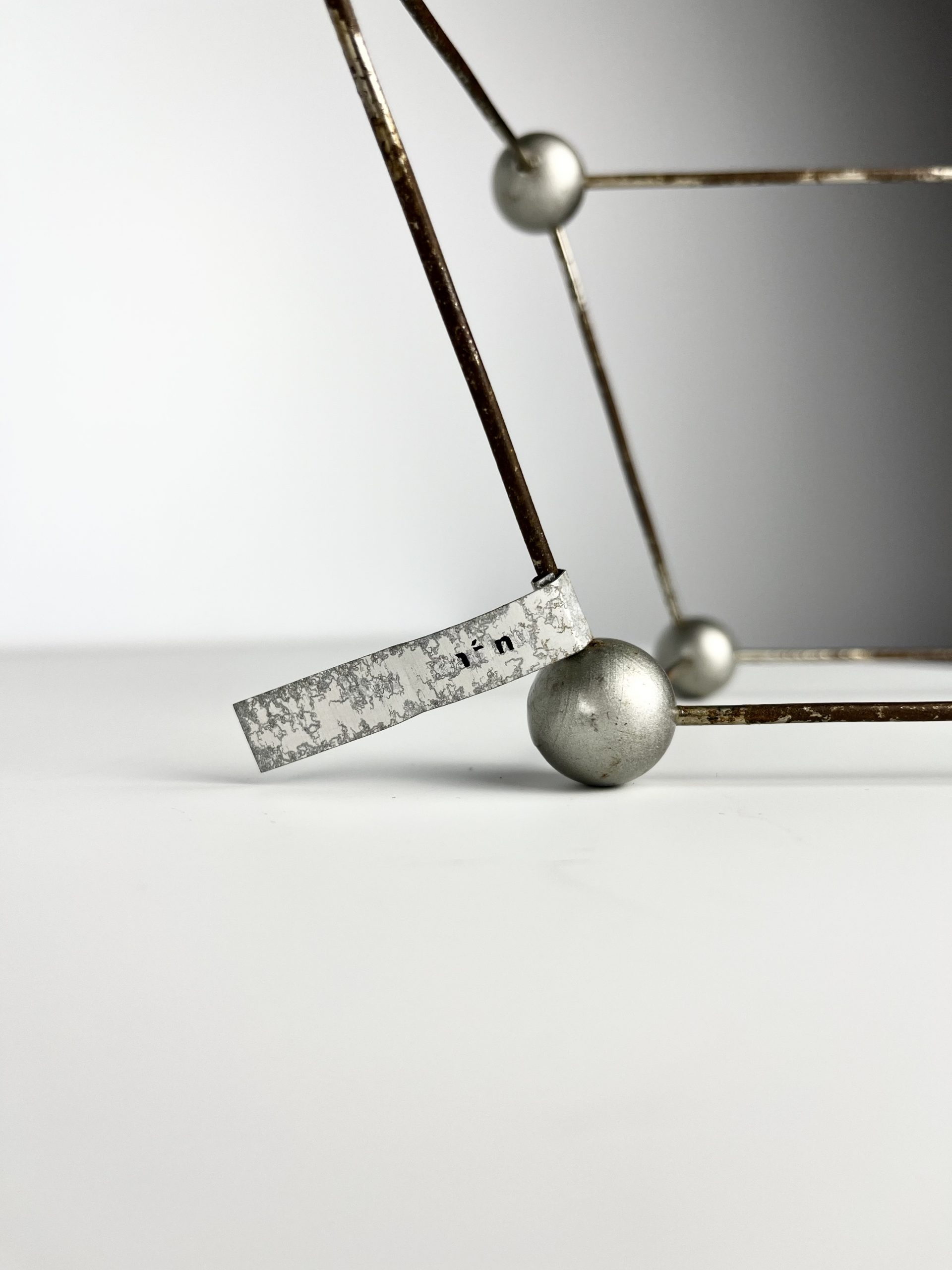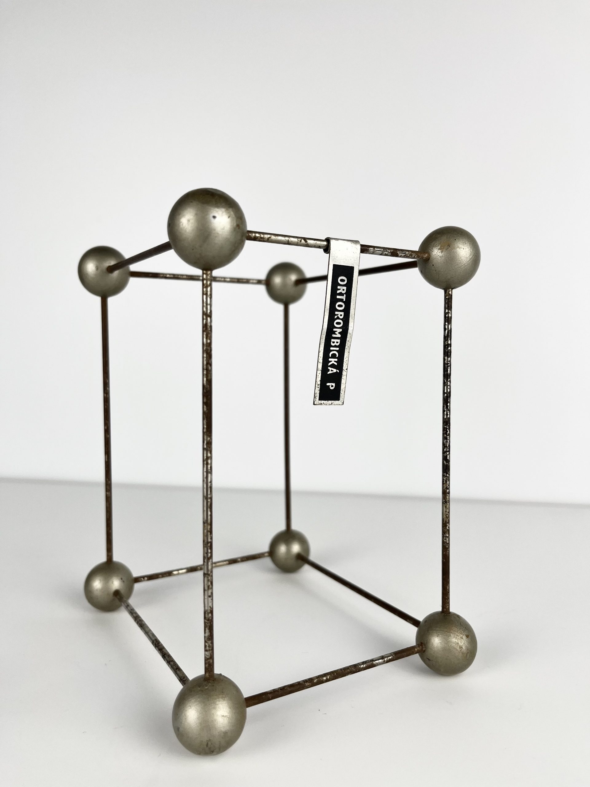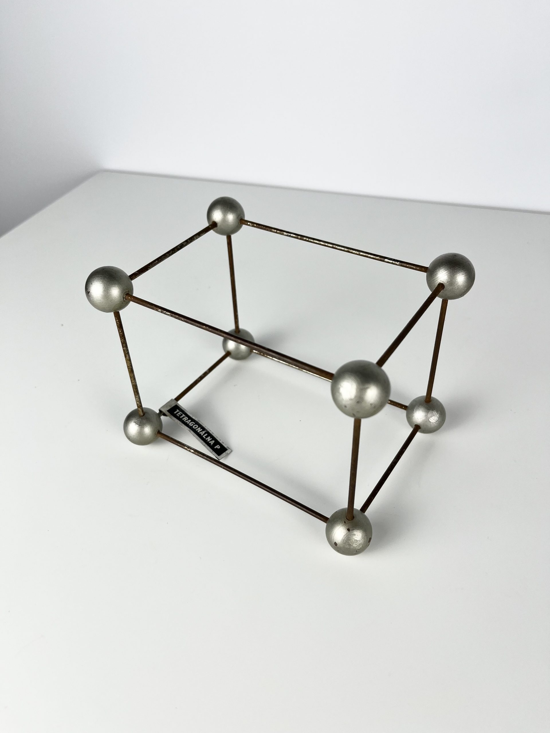 Designed as teaching aids to demonstrate microscopic crystal structures, they’re constructed from brushed metal spheres connected by steel rods.