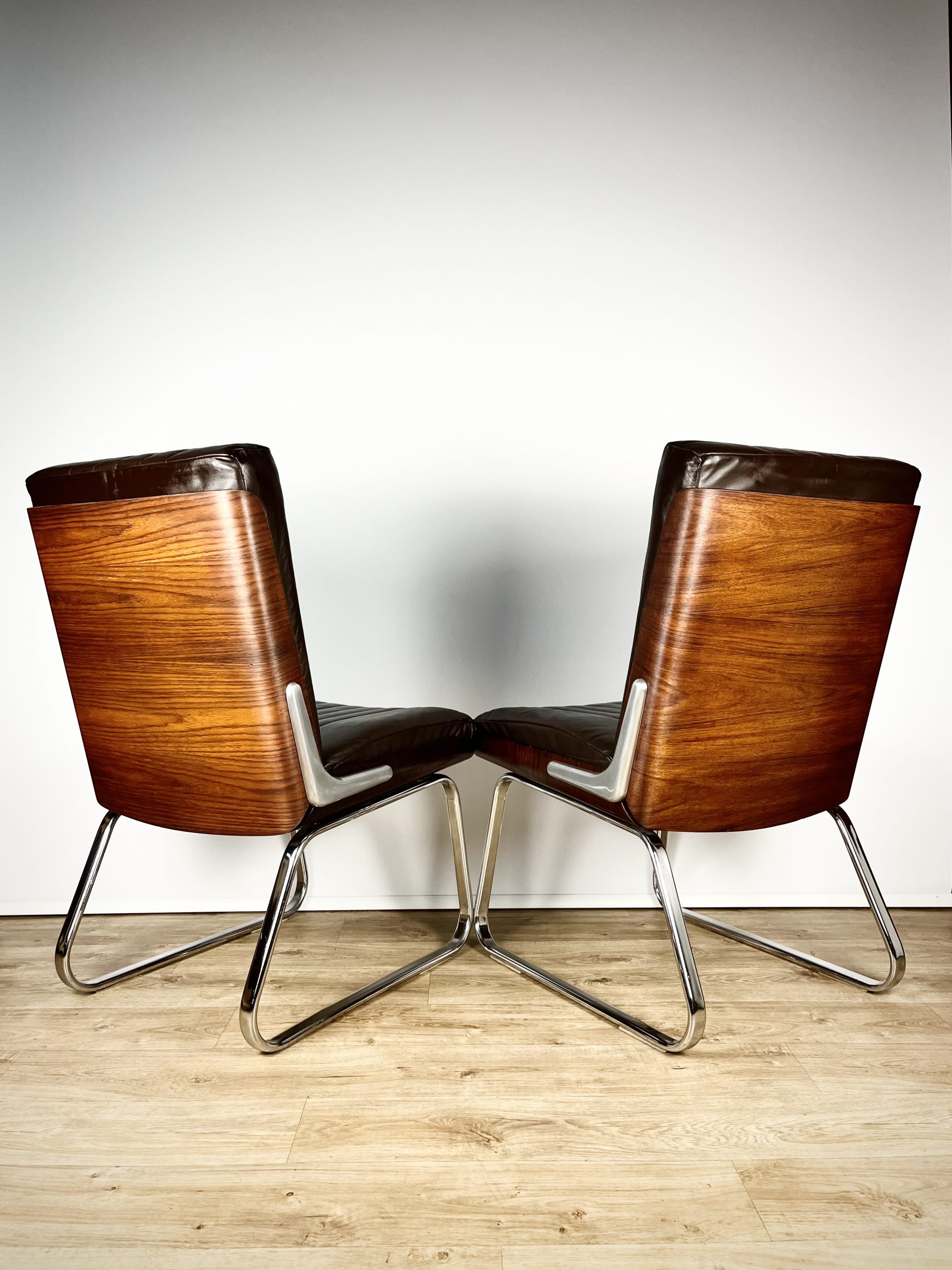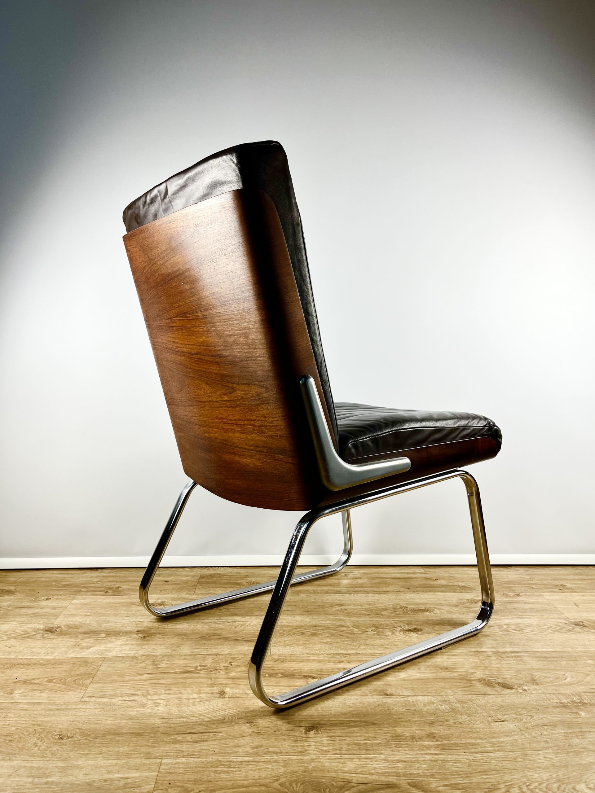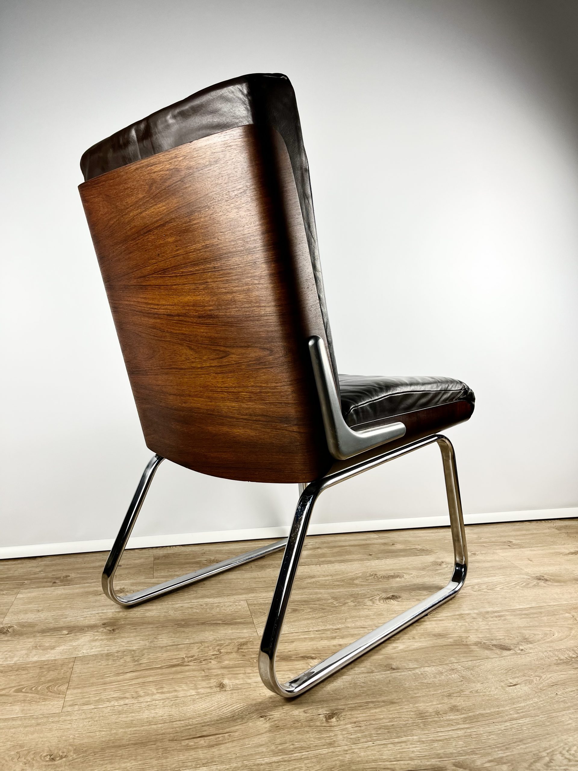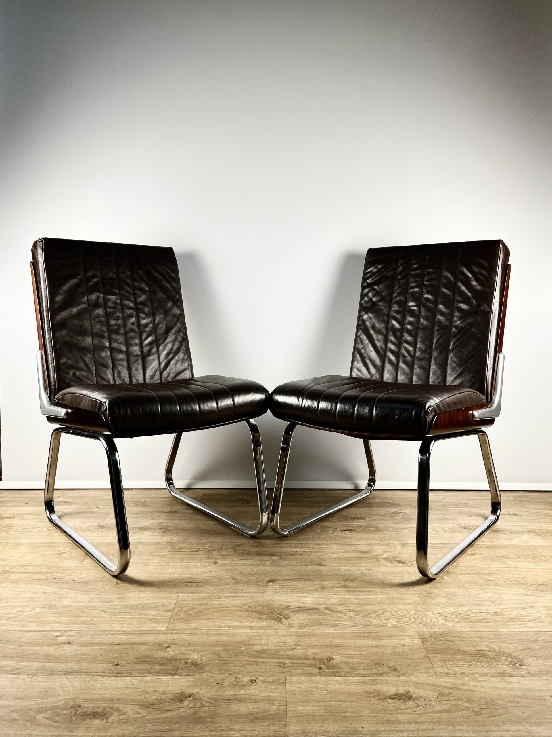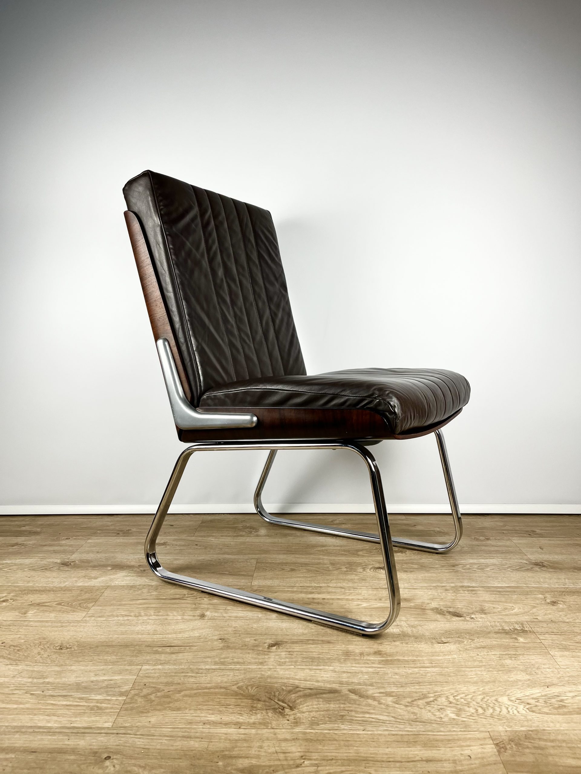 Produced in Britain during the 1980s, they feature chrome sleigh legs, stunning Rosewood veneered backs, and are luxuriously upholstered in dark chocolate leather.