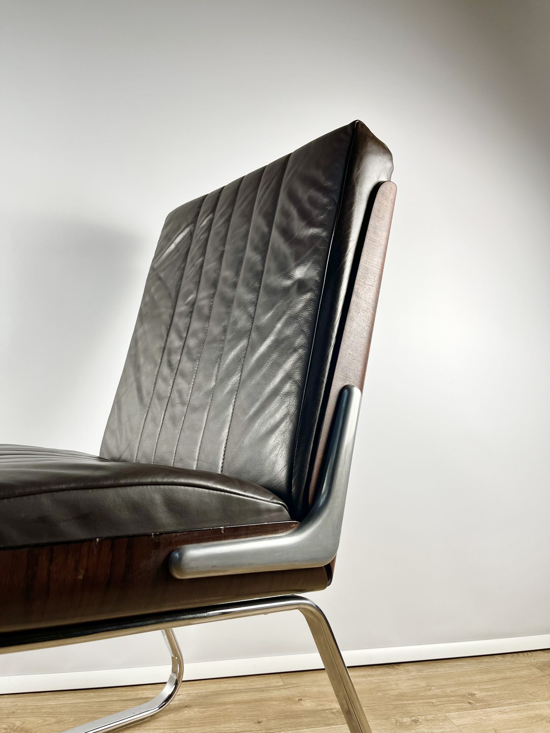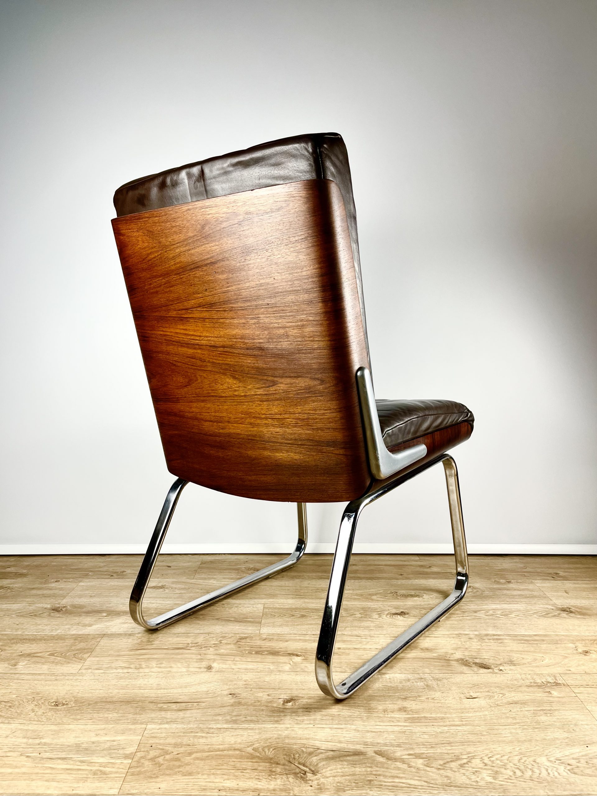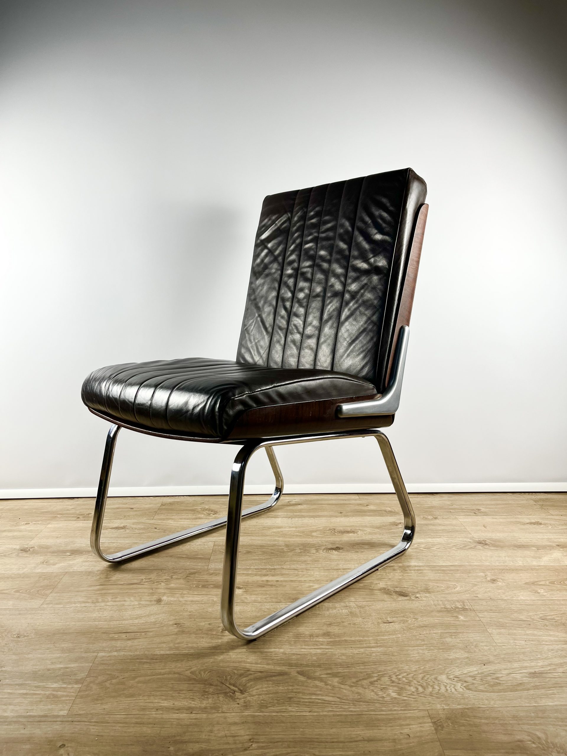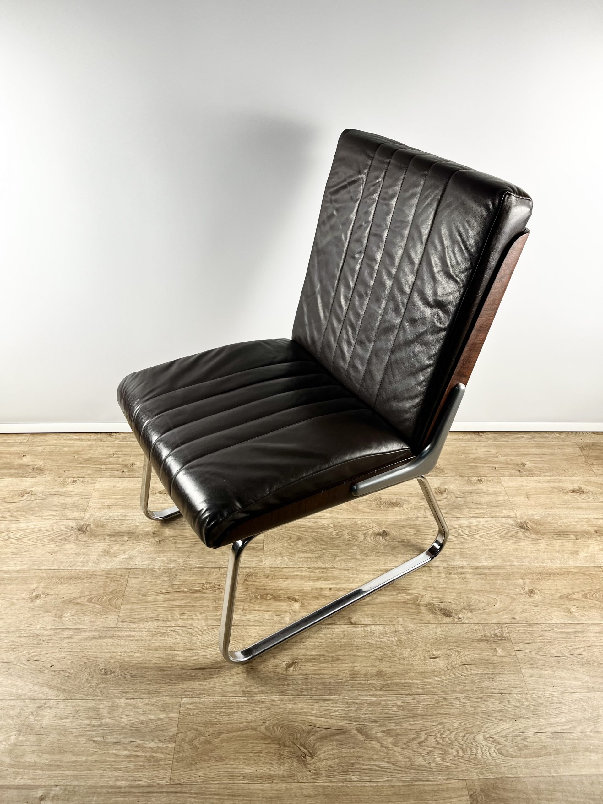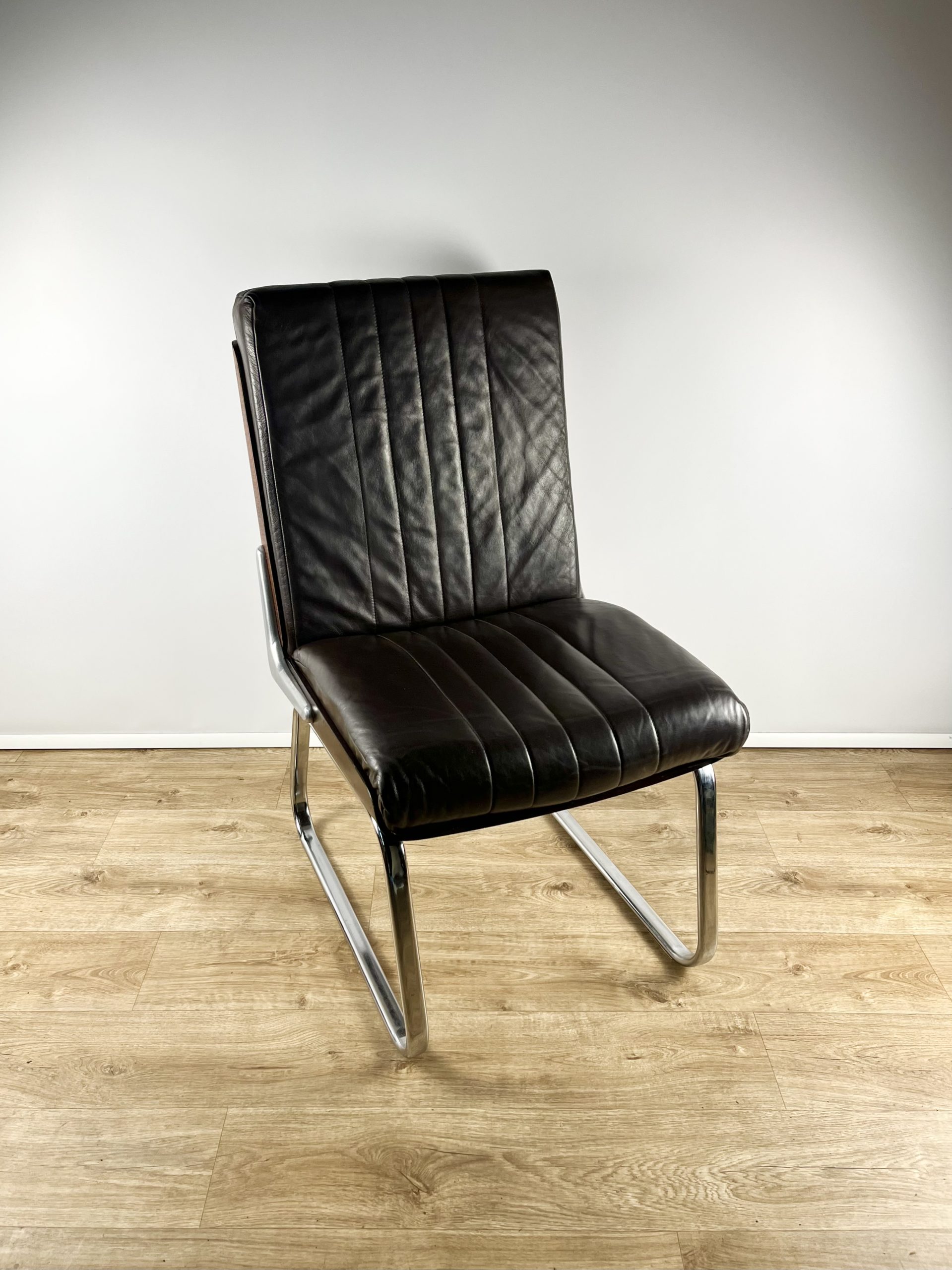 Produced in Britain during the 1980s, they feature chrome sleigh legs, stunning Rosewood veneered backs, and are luxuriously upholstered in dark chocolate leather.