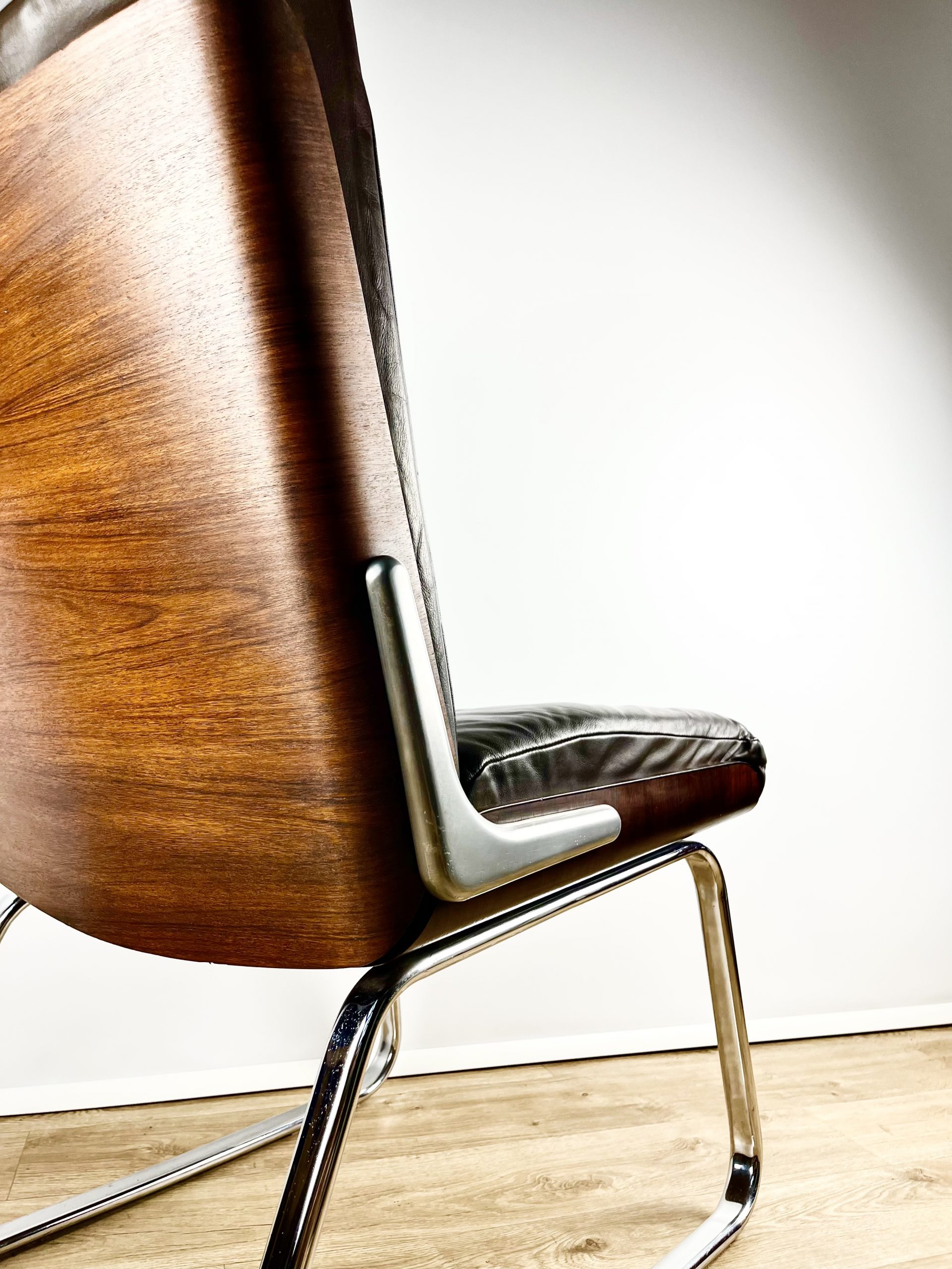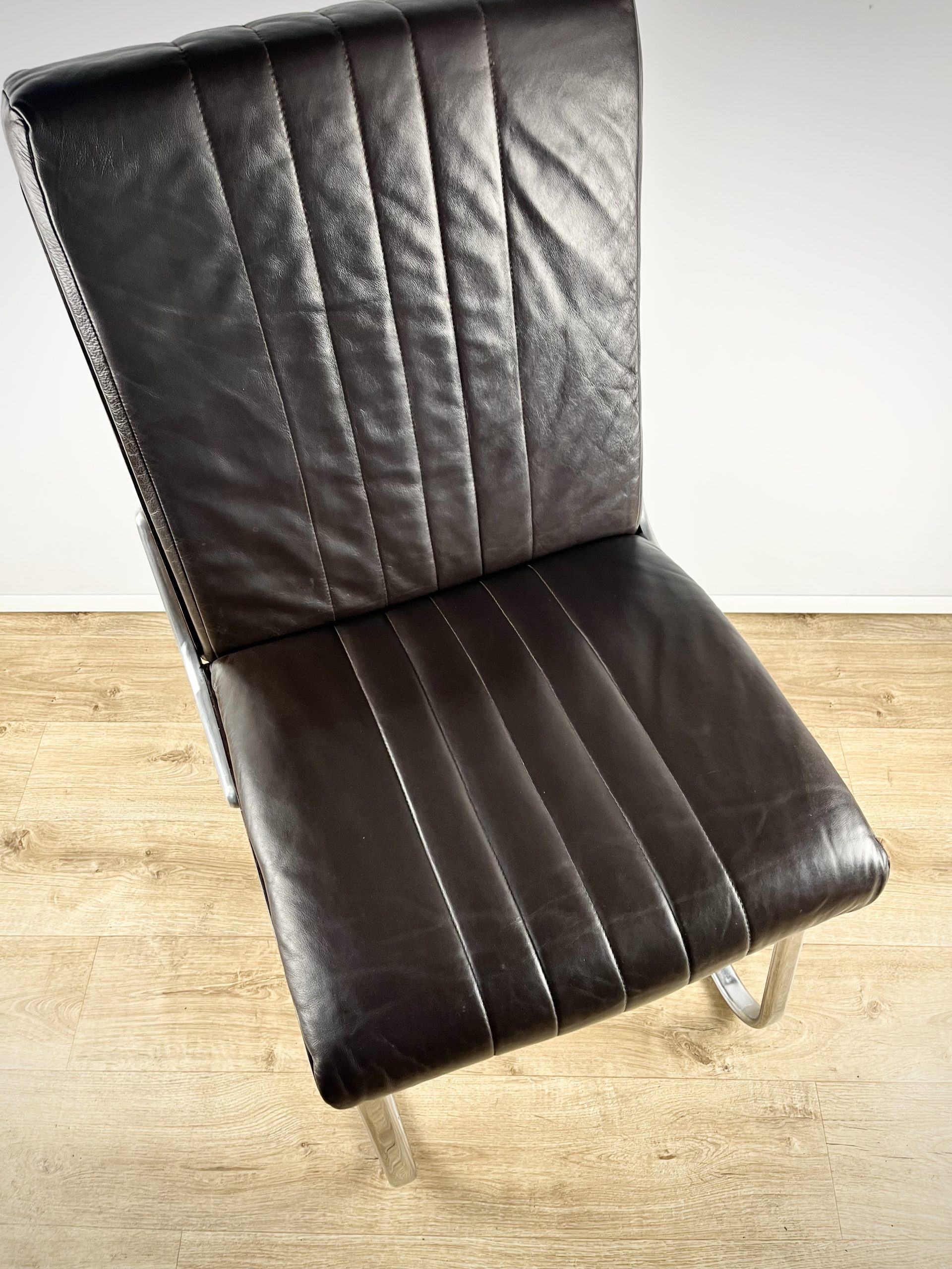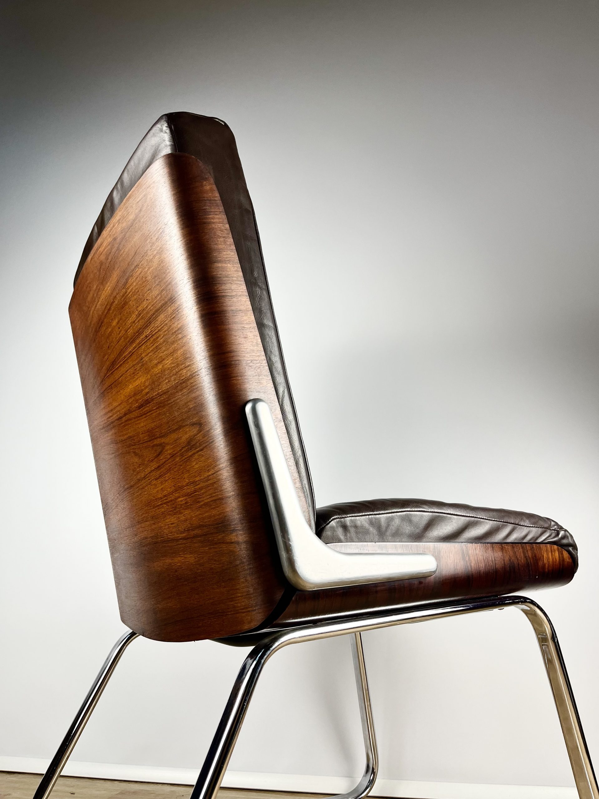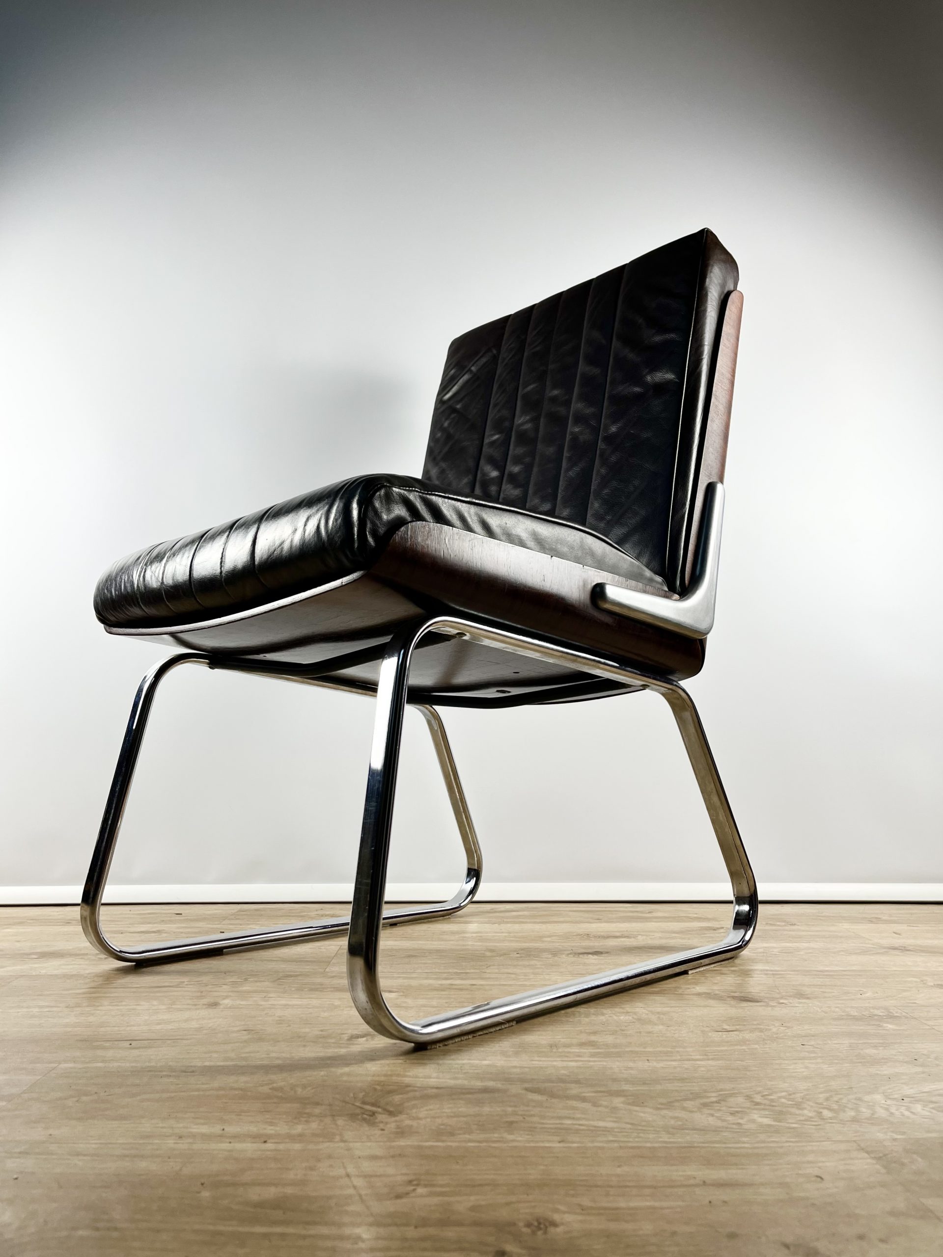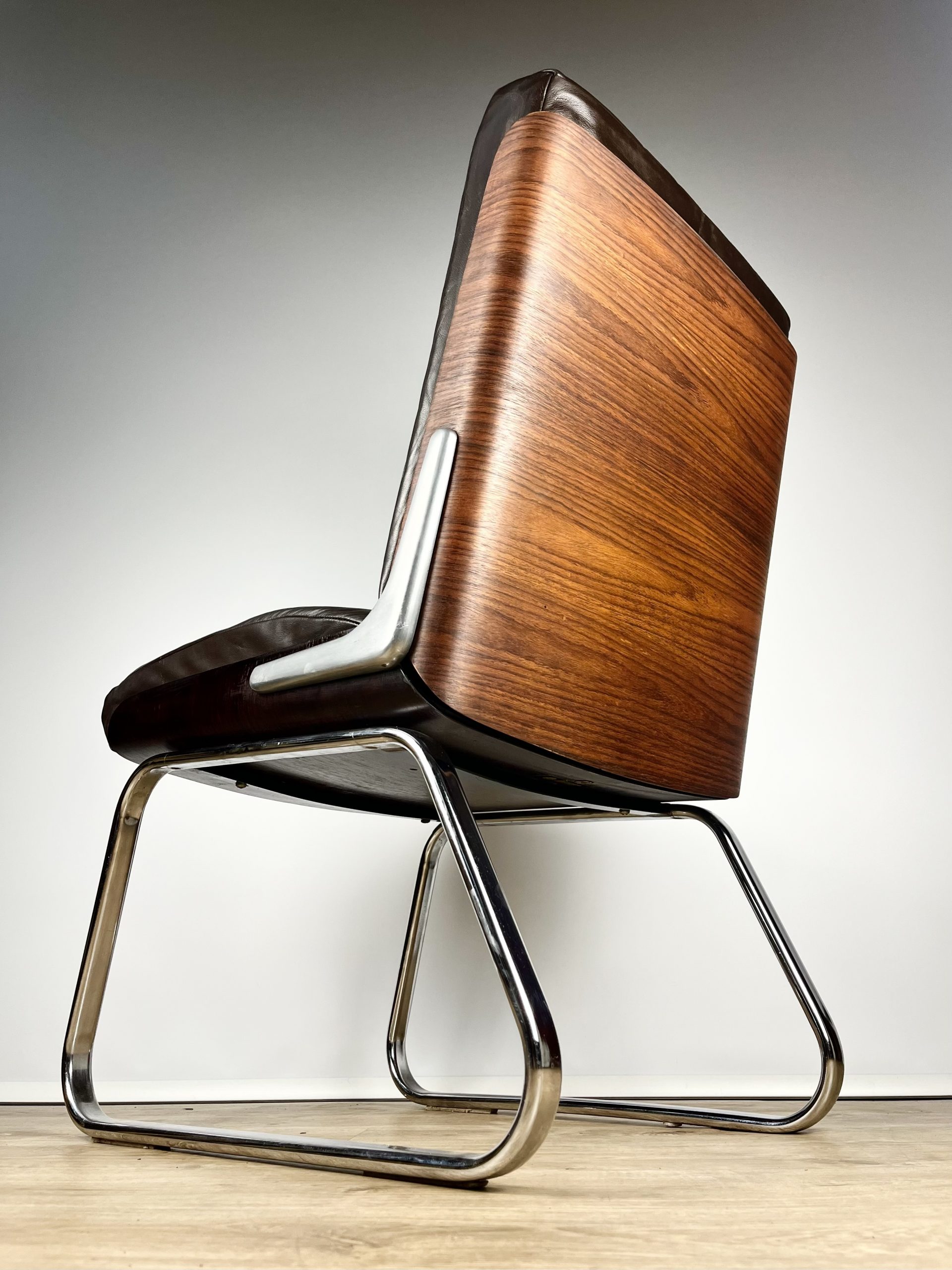 Produced in Britain during the 1980s, they feature chrome sleigh legs, stunning Rosewood veneered backs, and are luxuriously upholstered in dark chocolate leather.