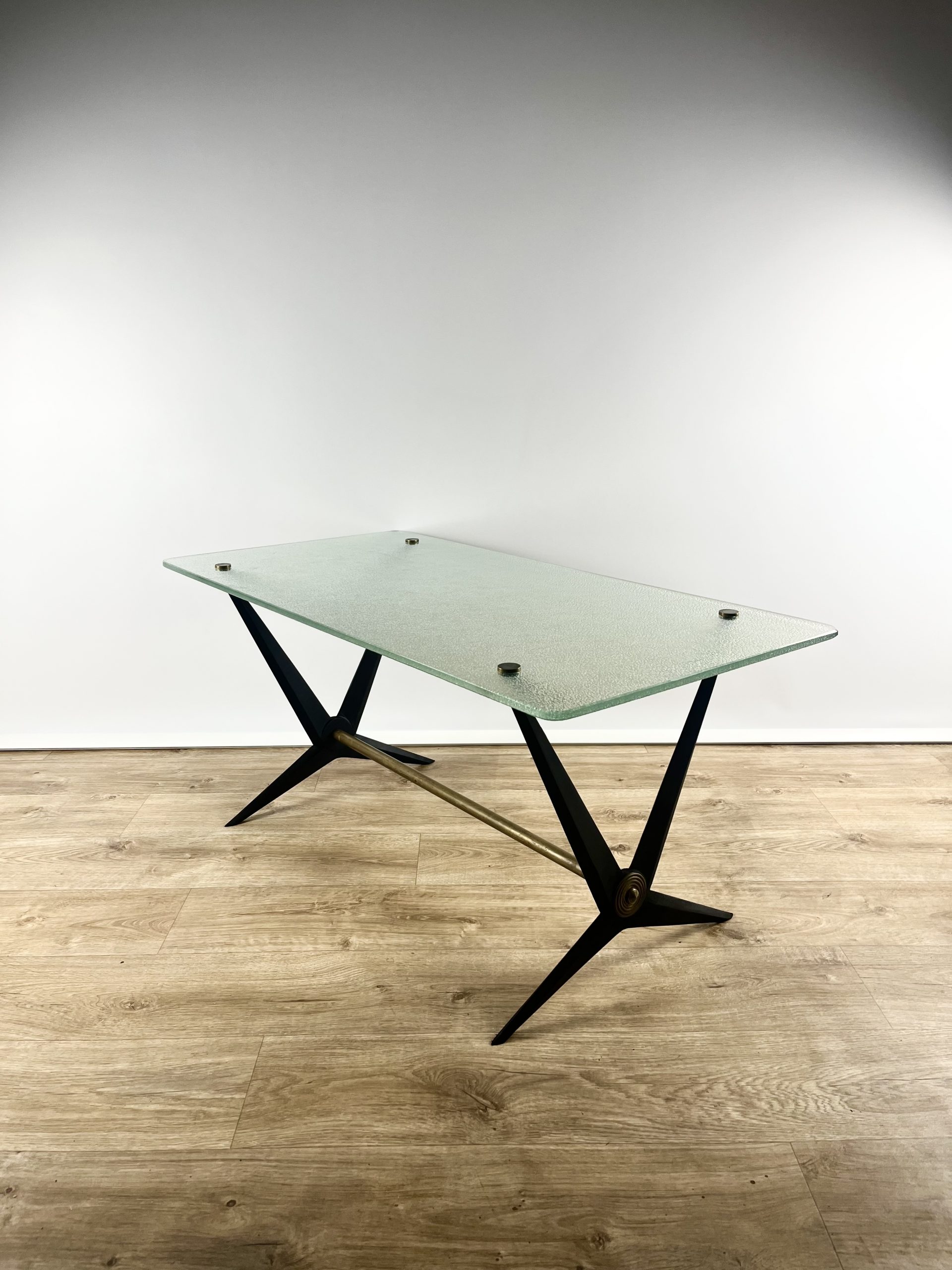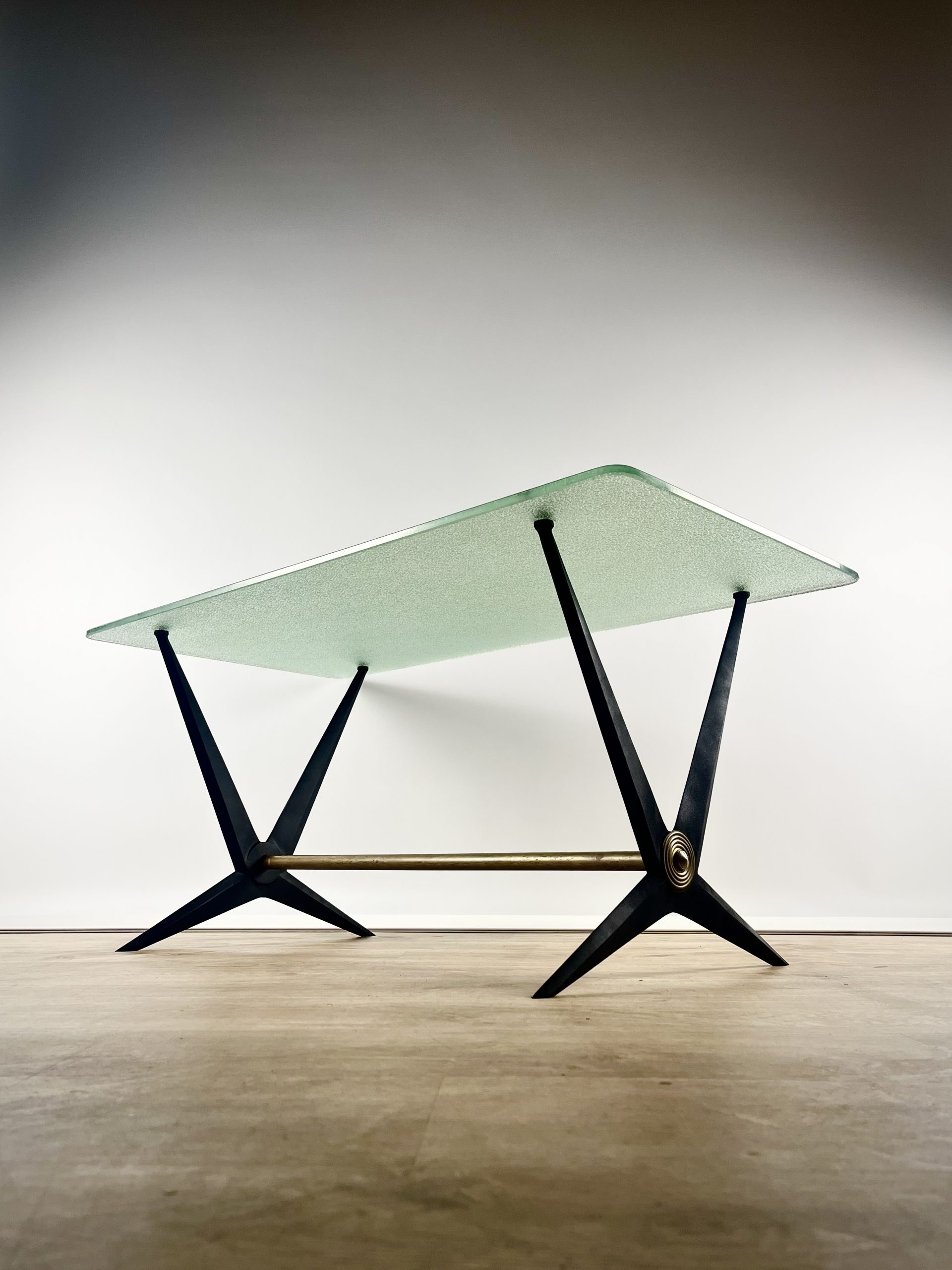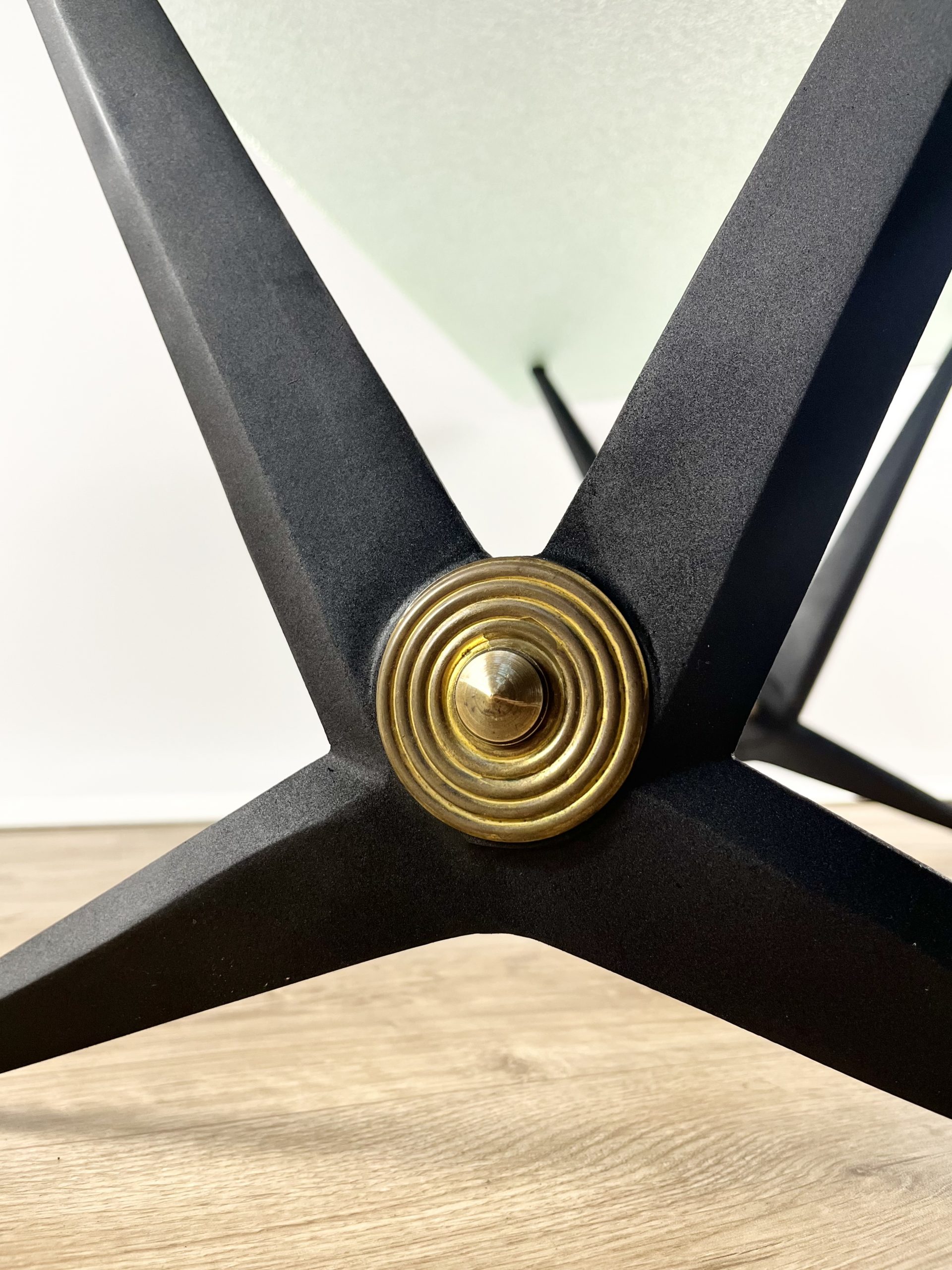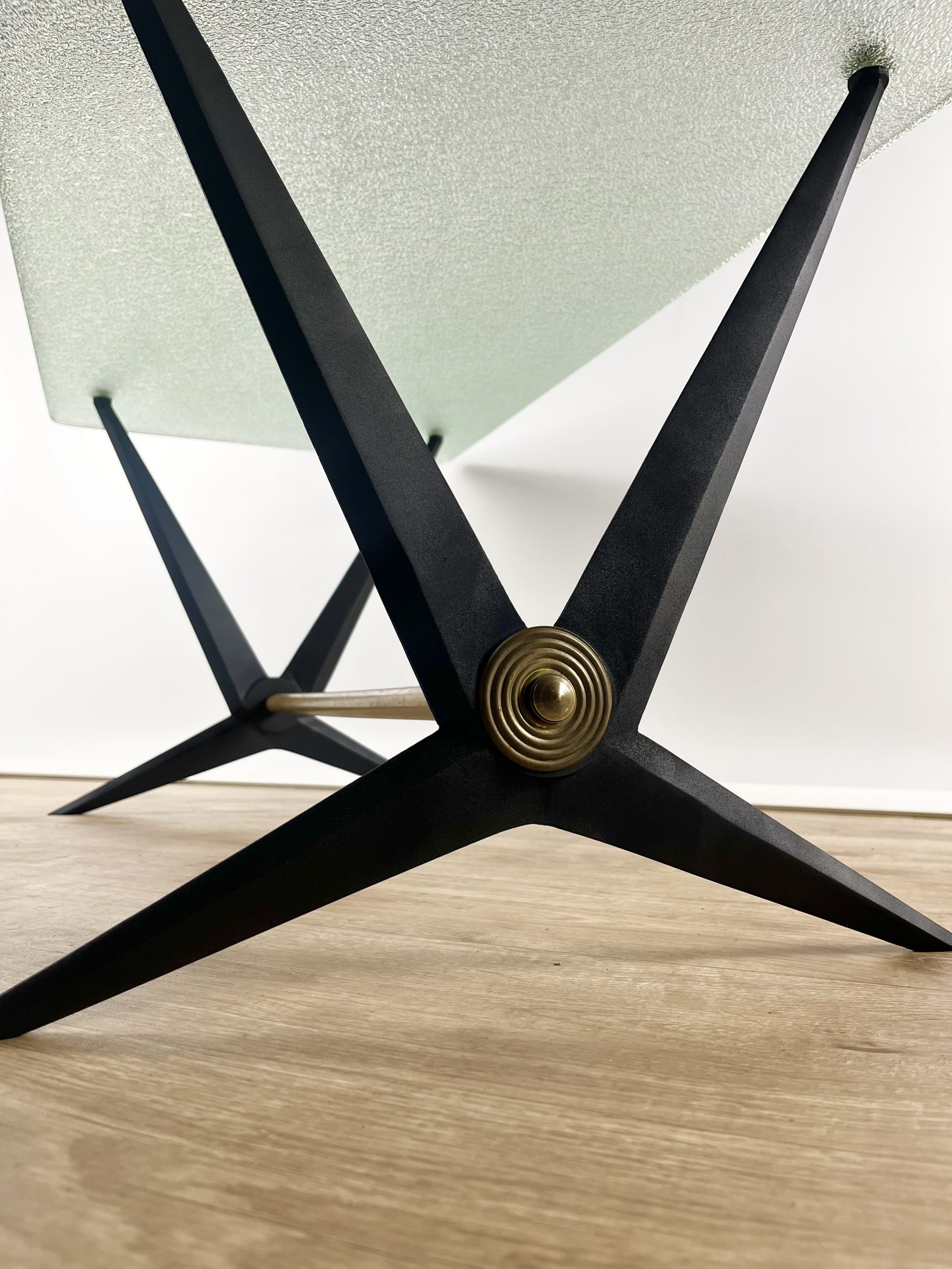 A 10mm thick slab of frosted glass raised on black, insect-like metal limbs, which are connected by a single brass rod and capped off with beautifully patinaed brass finials.