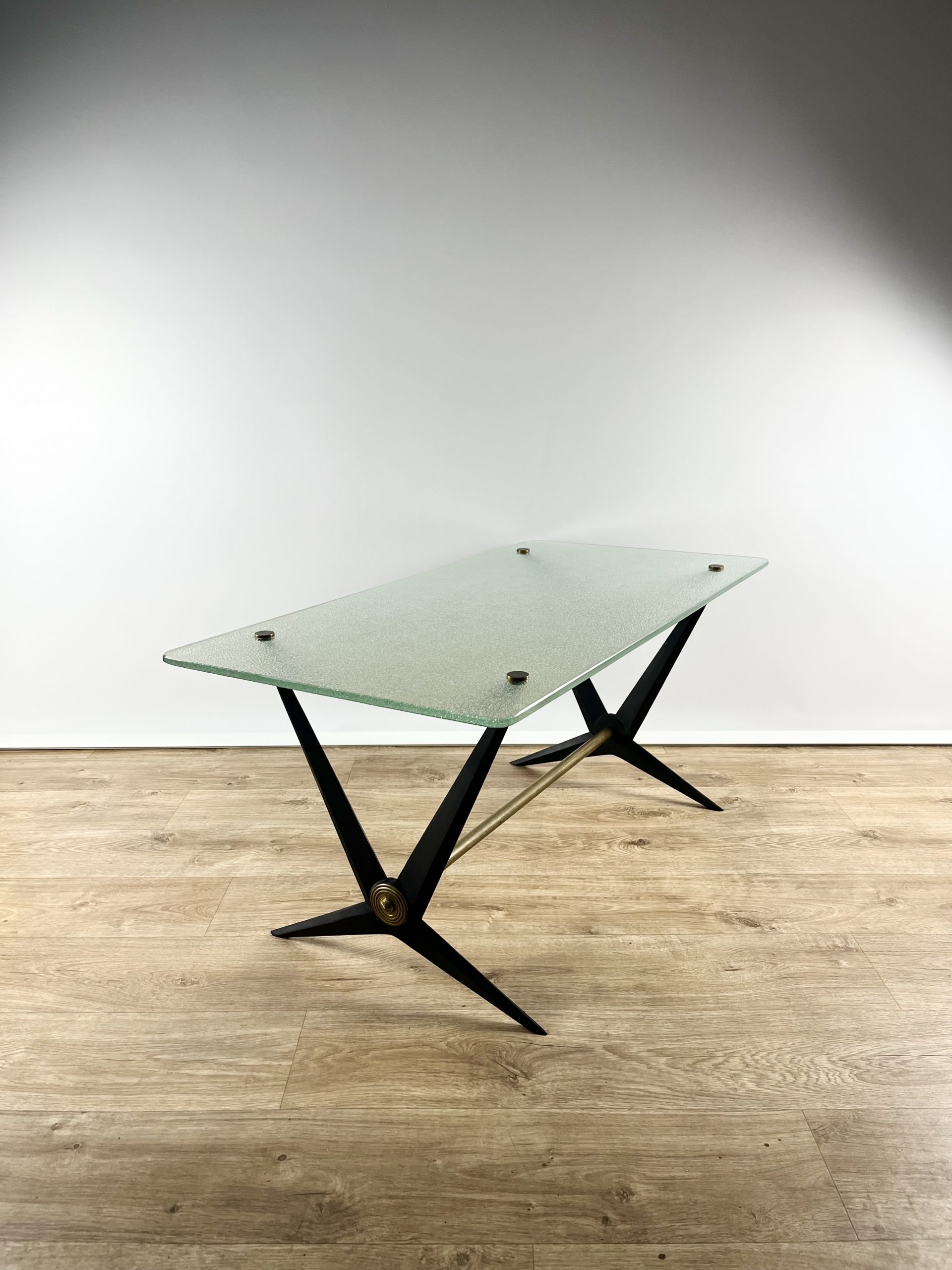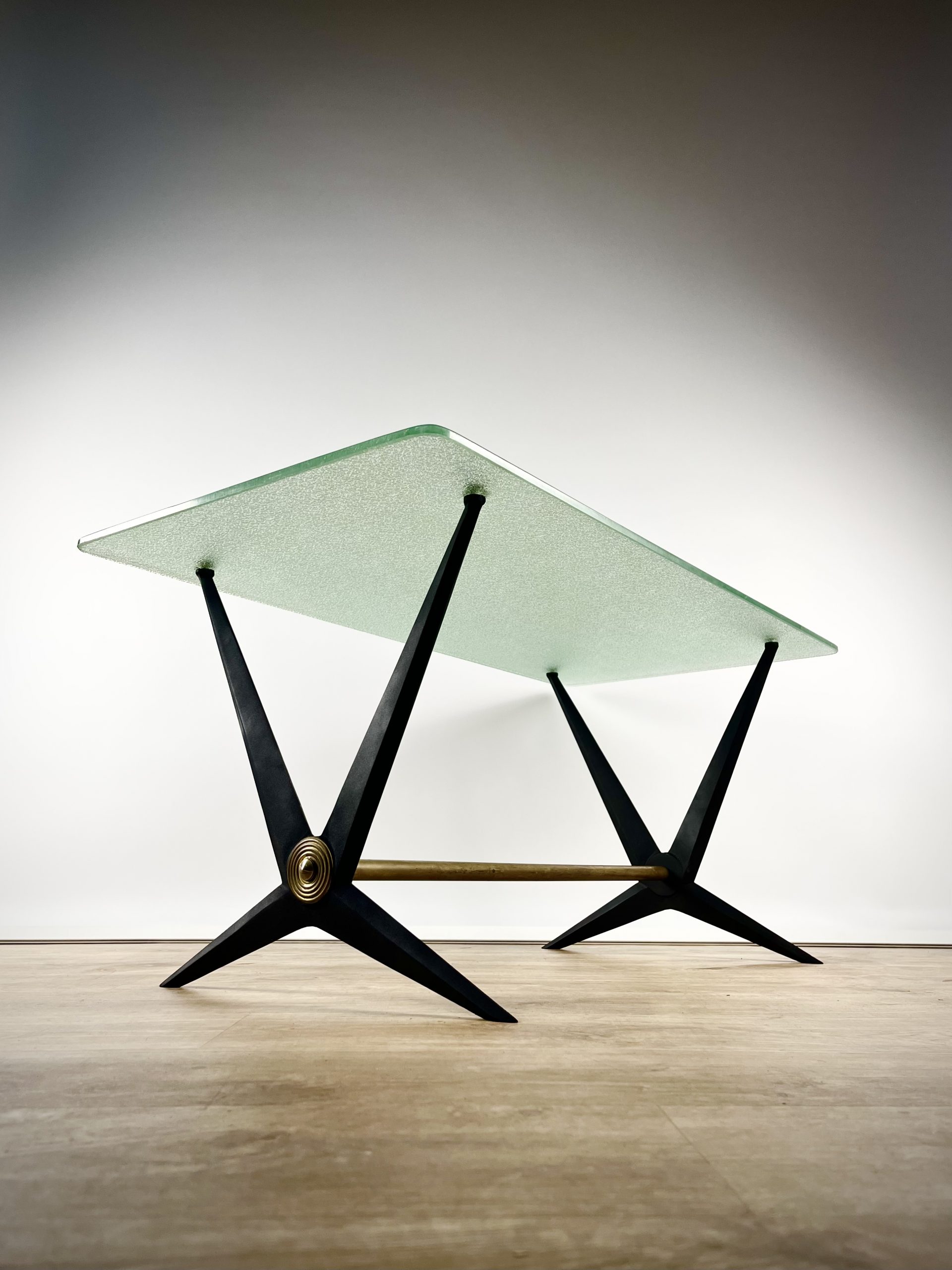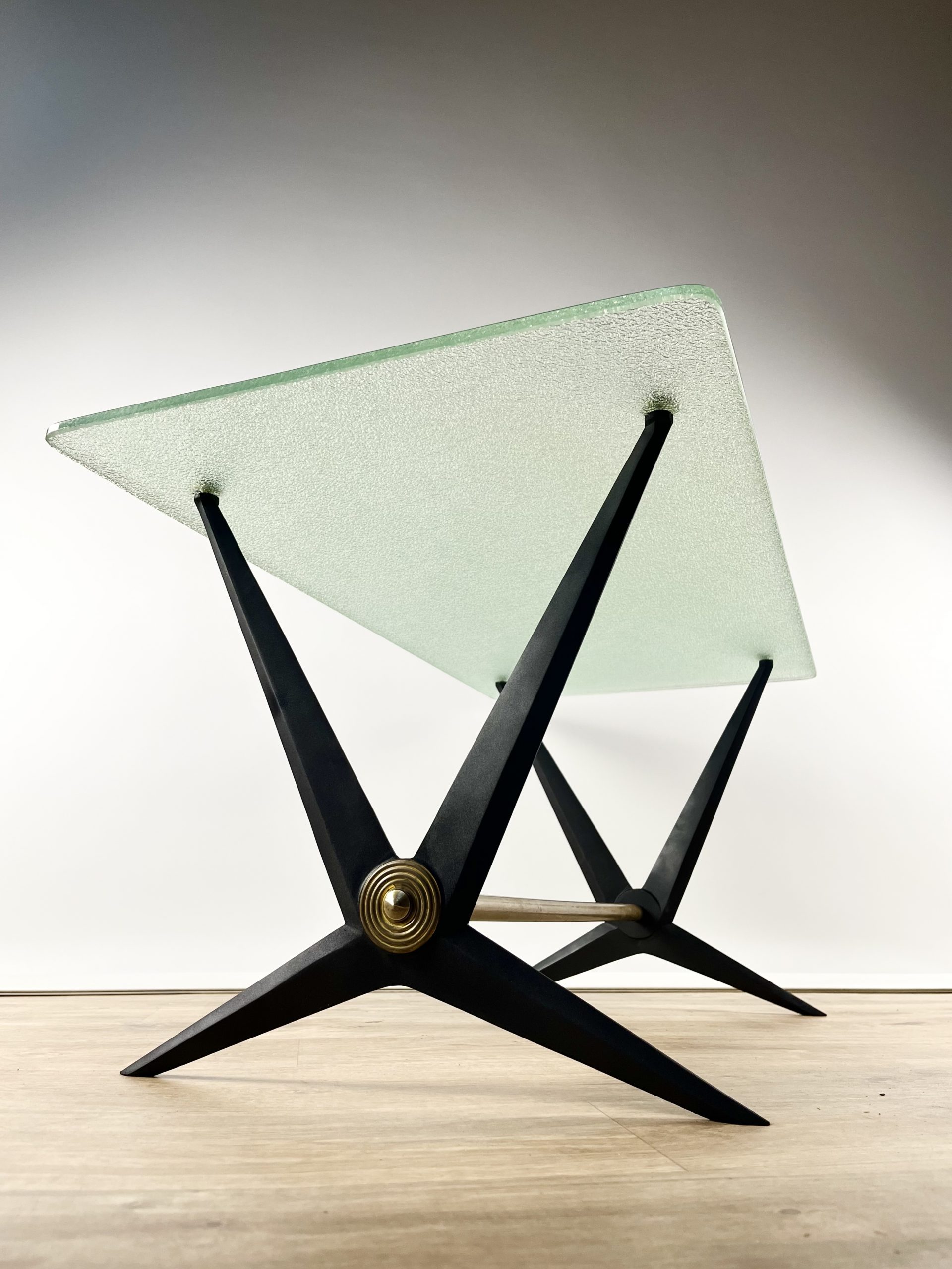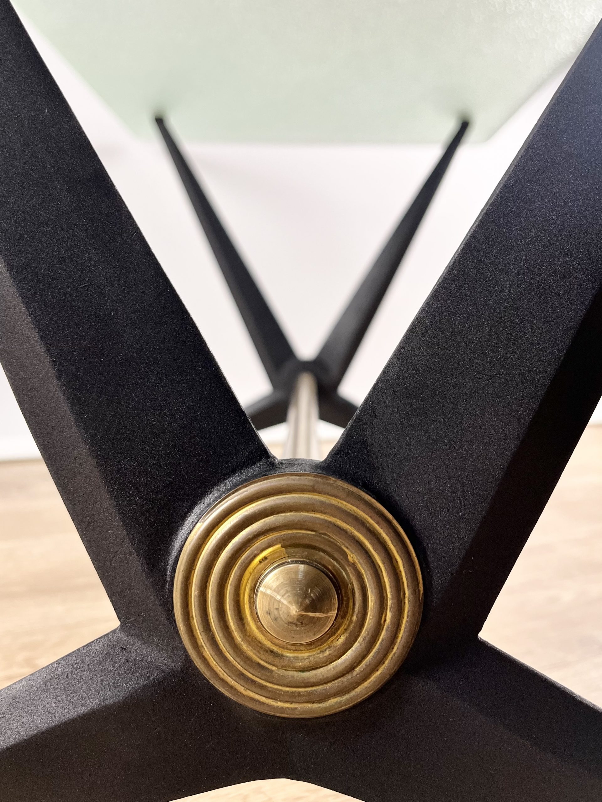 A 10mm thick slab of frosted glass raised on black, insect-like metal limbs, which are connected by a single brass rod and capped off with beautifully patinaed brass finials.