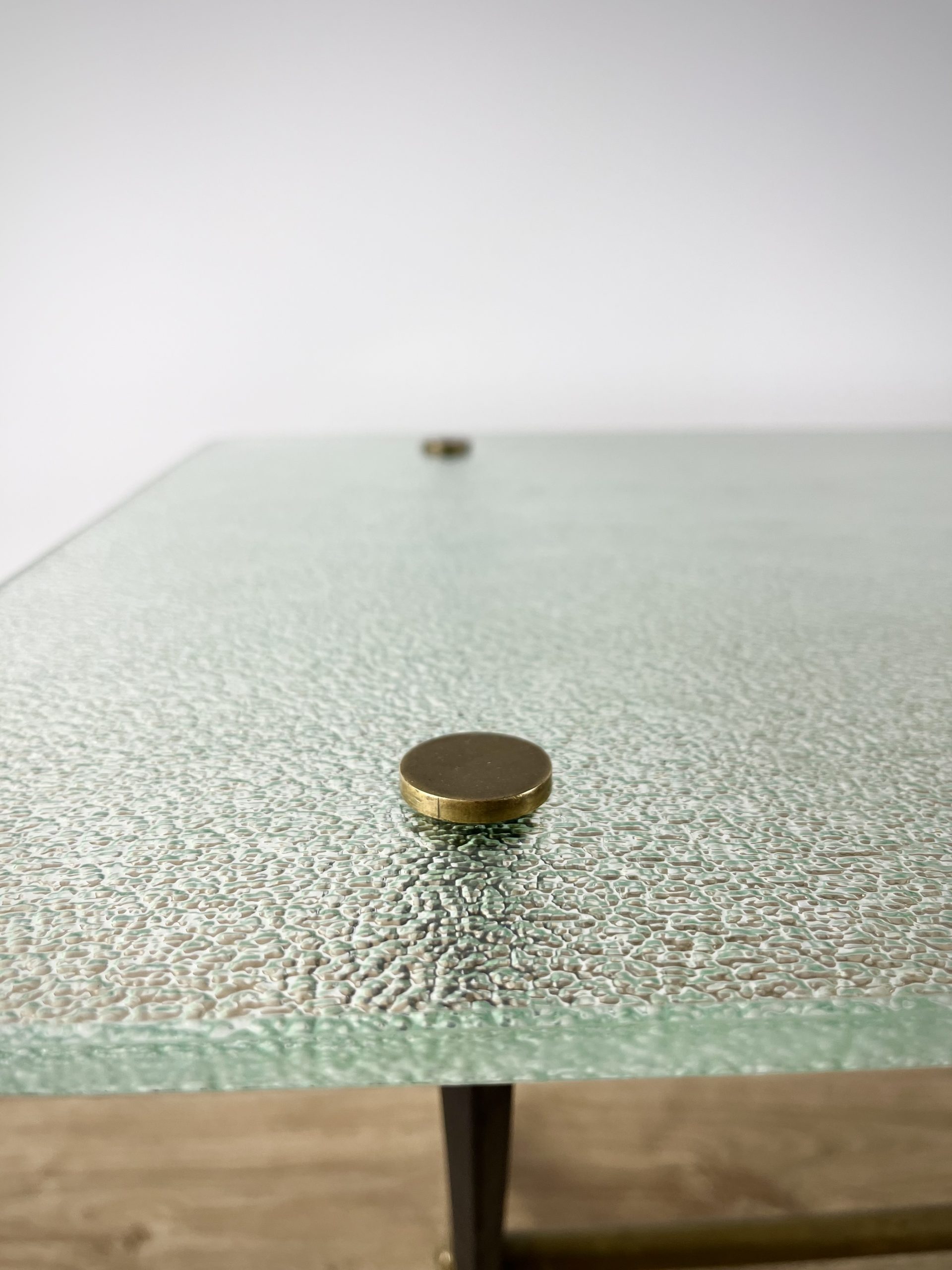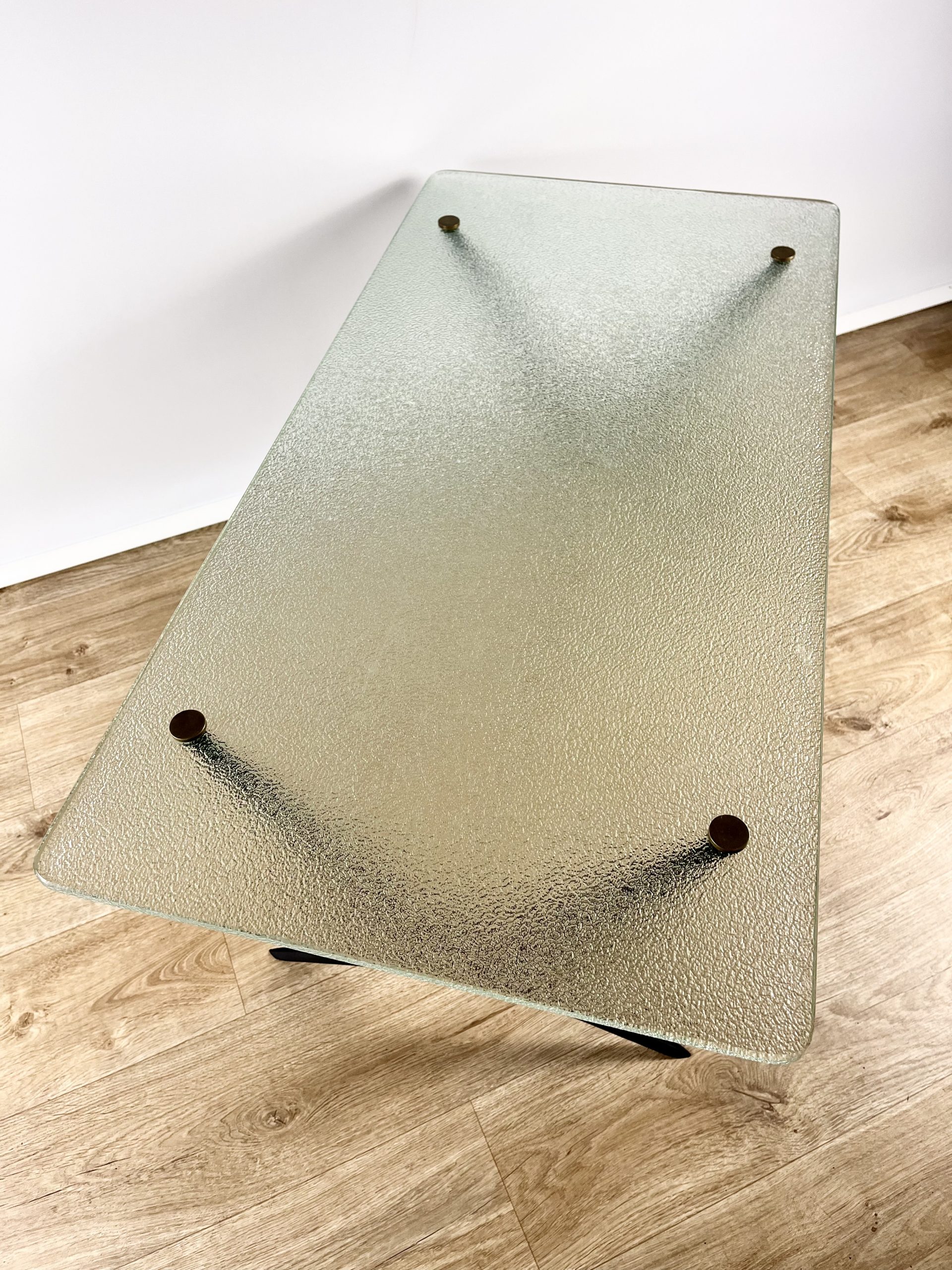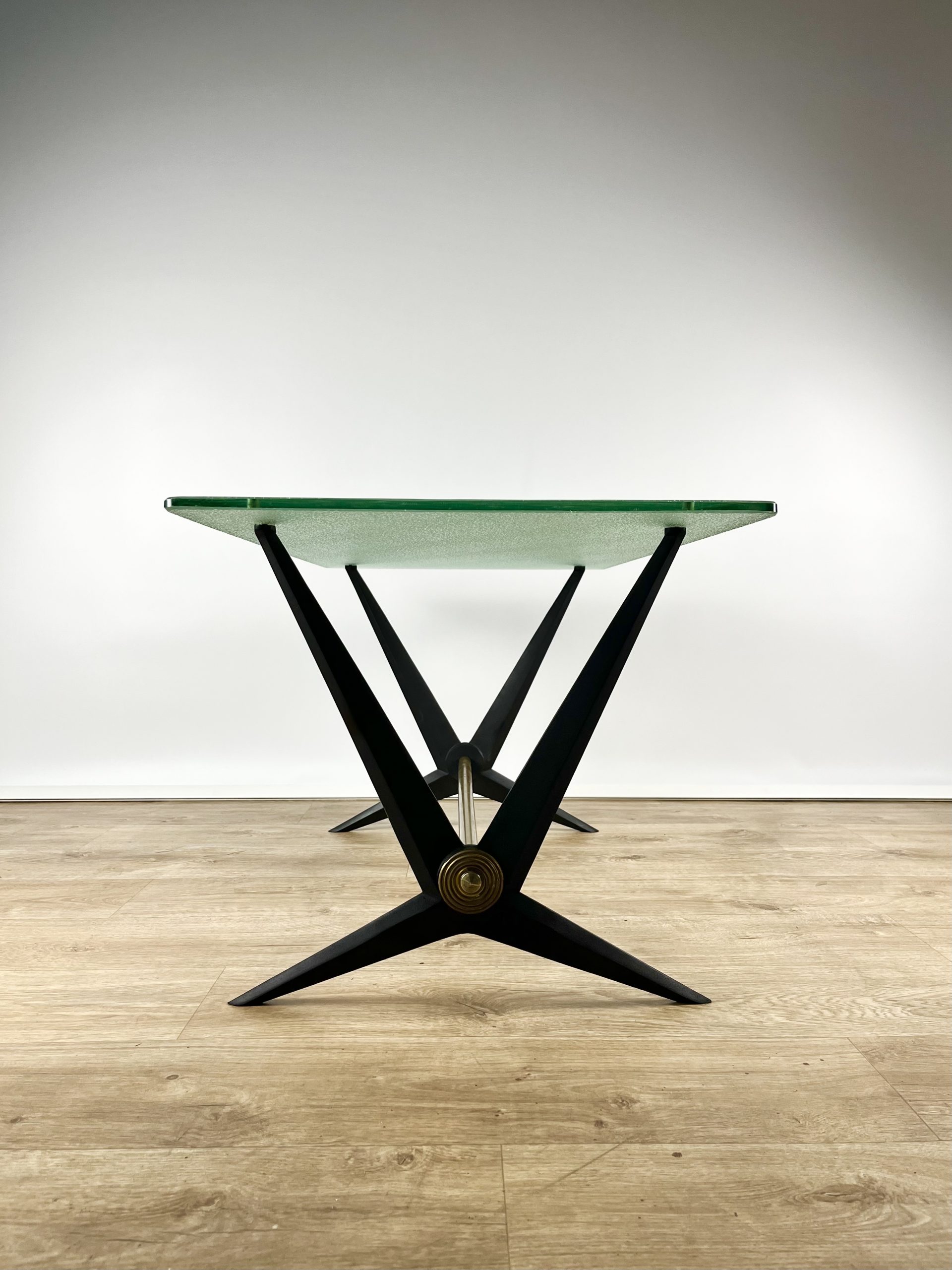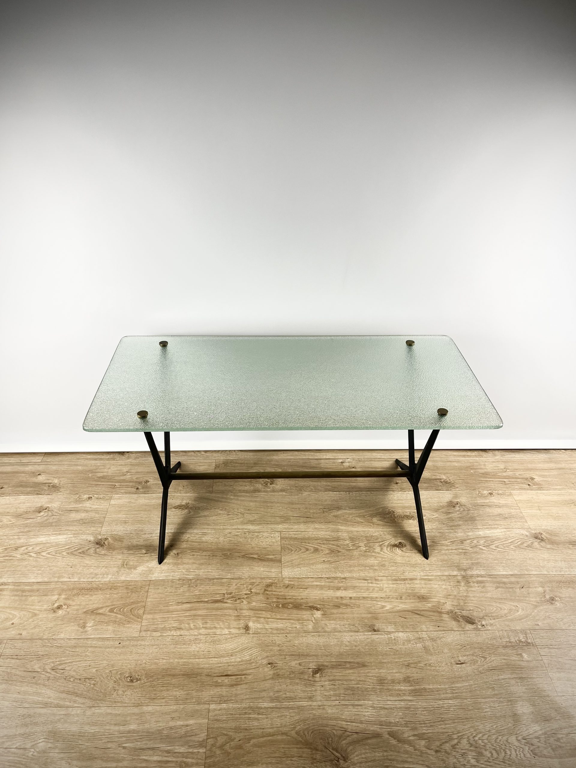 A 10mm thick slab of frosted glass raised on black, insect-like metal limbs, which are connected by a single brass rod and capped off with beautifully patinaed brass finials.
