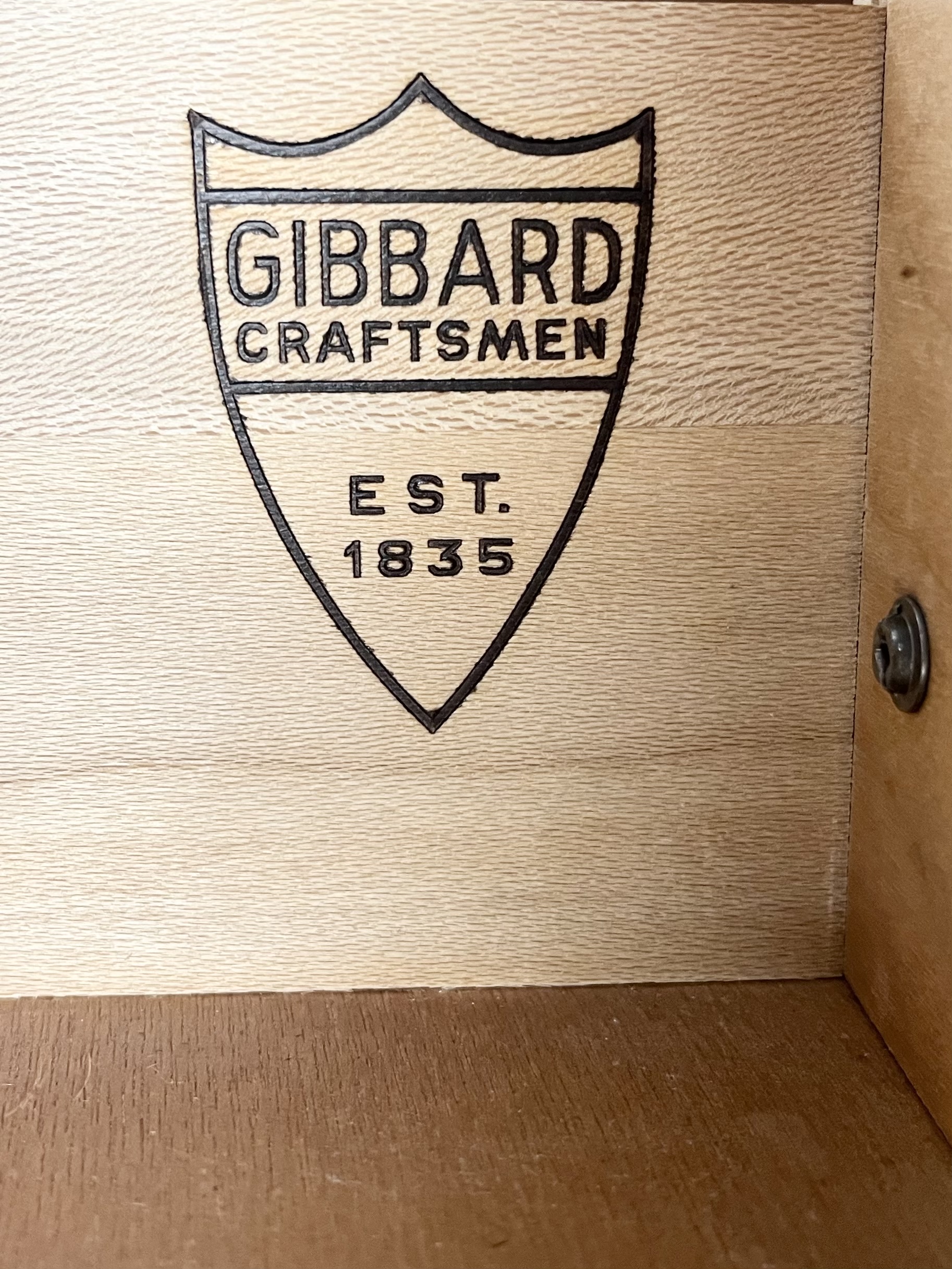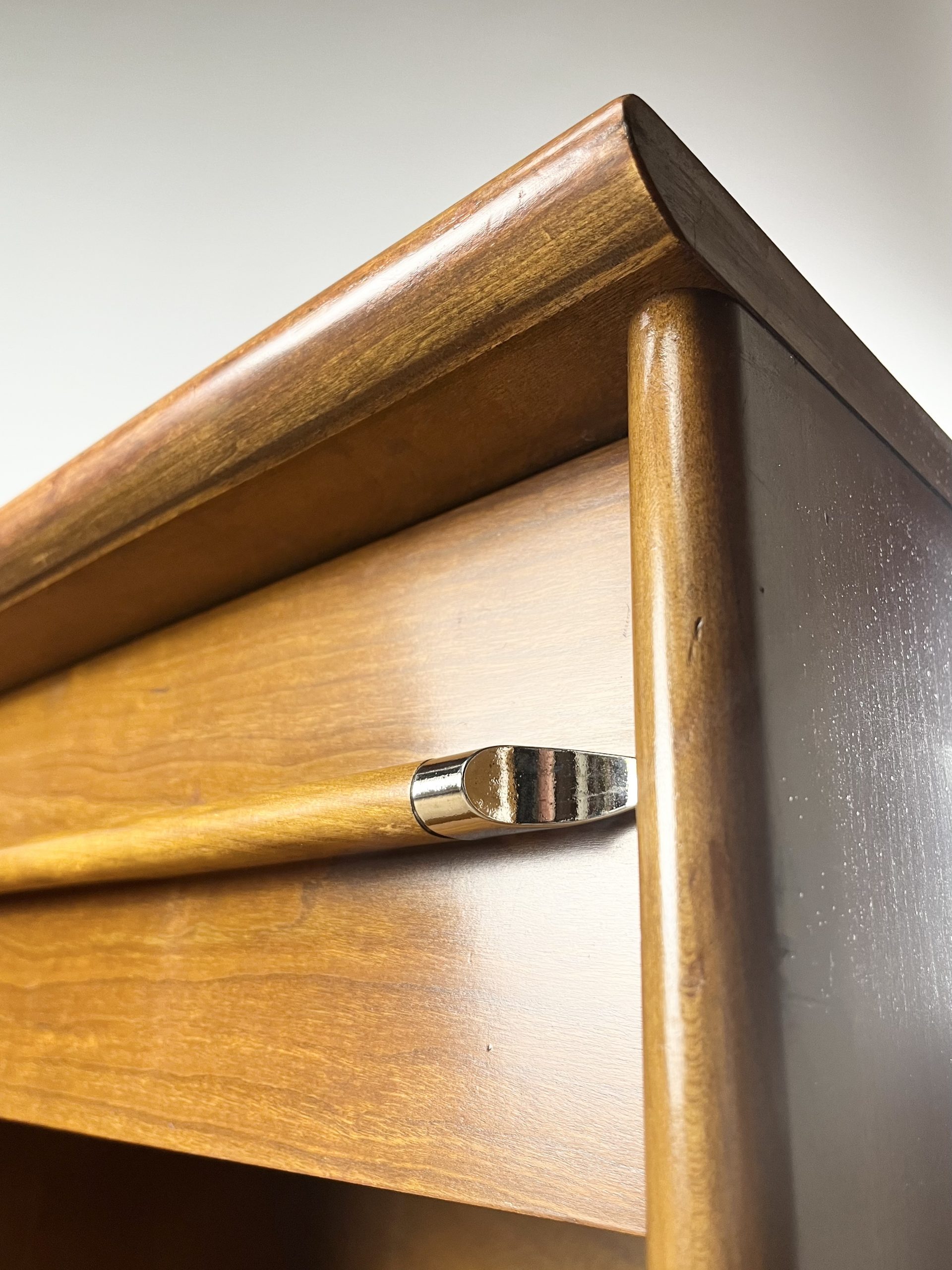 Produced by Canadian firm, Gibbard, they feature walnut veneered cabinets with generous storage and a single drawer, all raised on sculpted walnut legs. Slender drawer pulls capped with gleaming metal finials complete their stripped-down, modernist look.