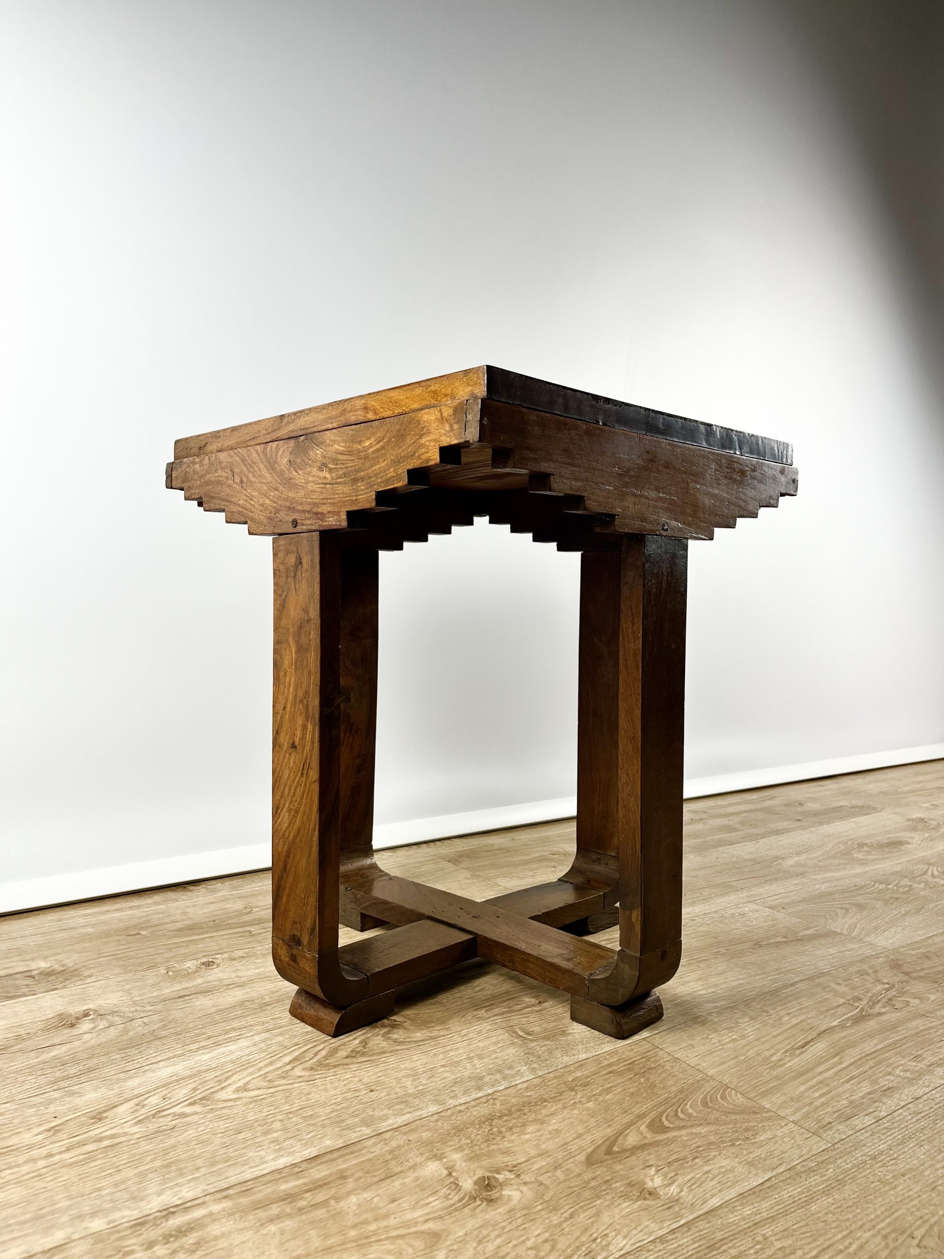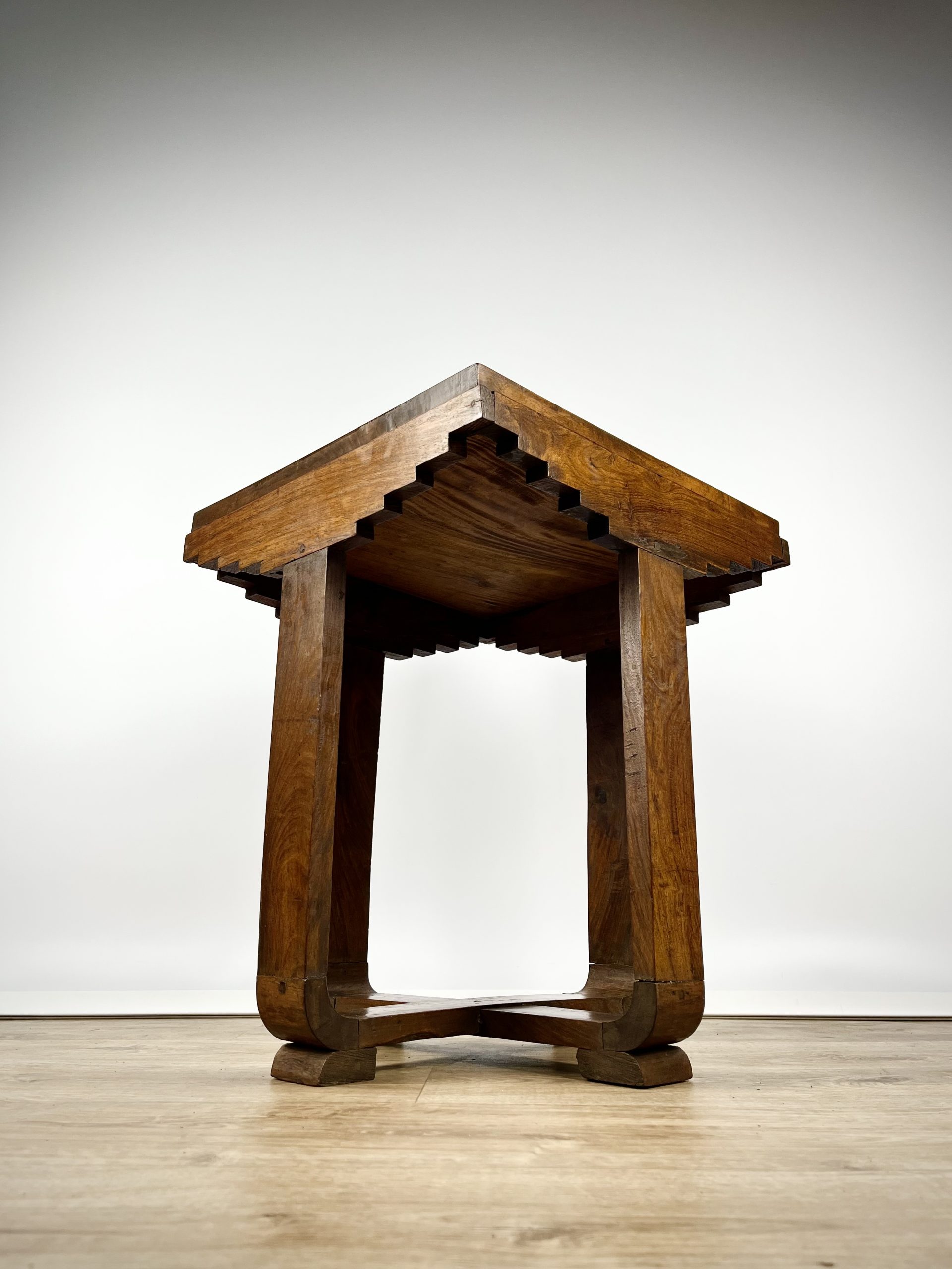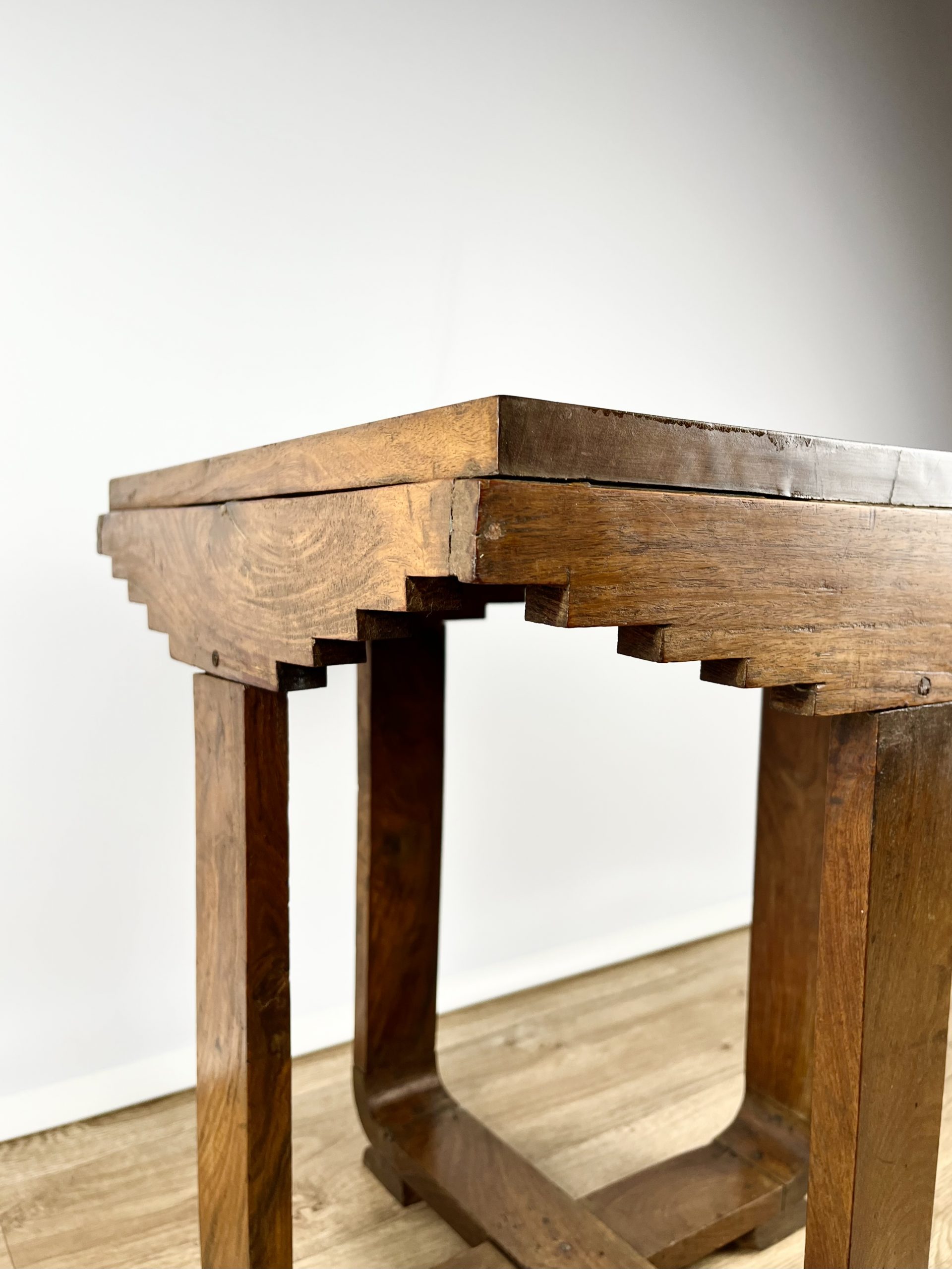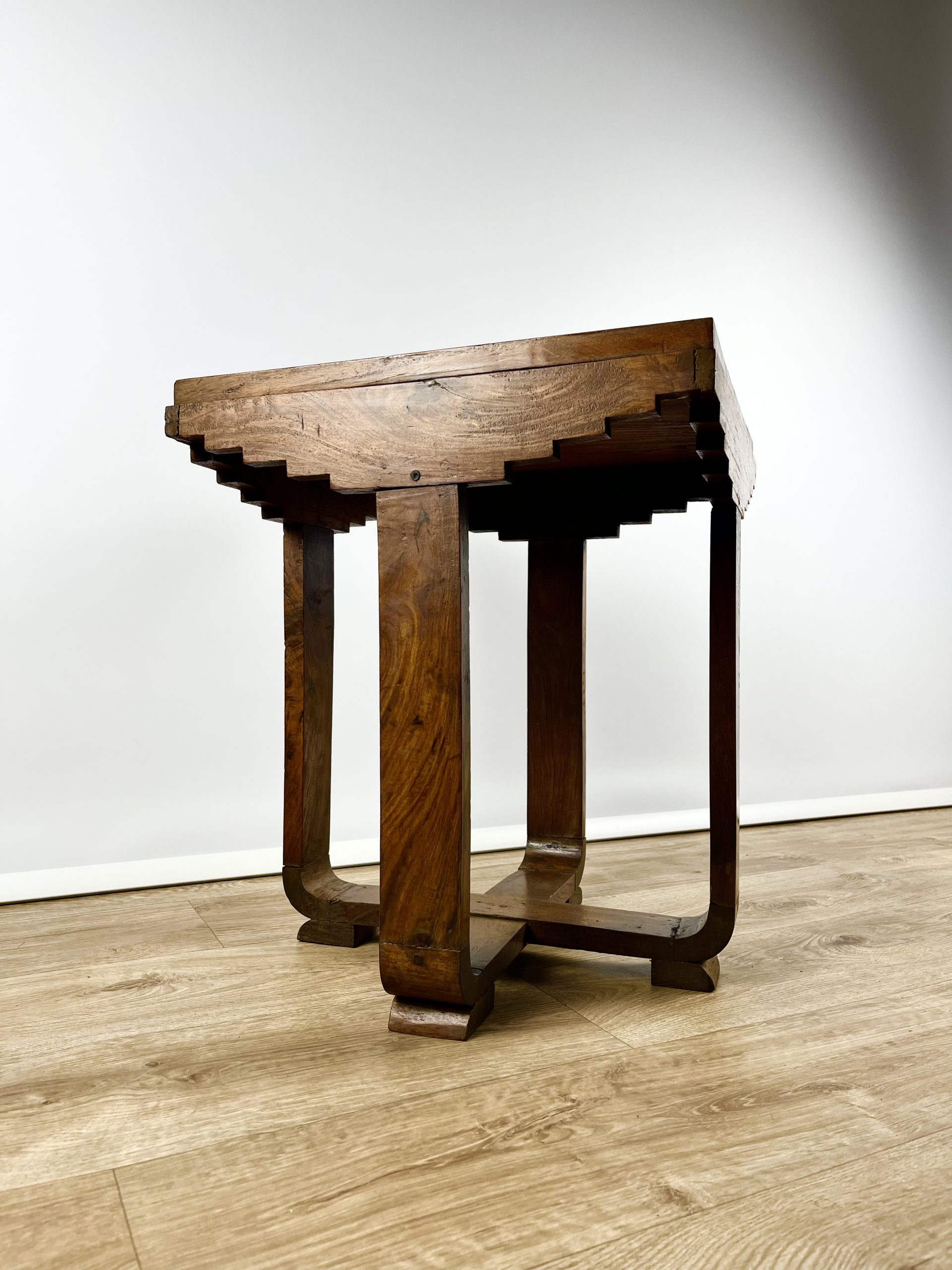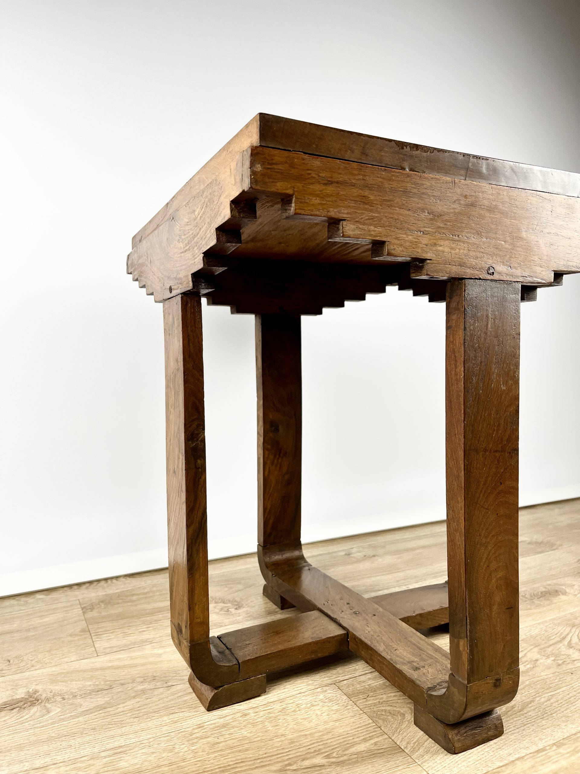 Crudely constructed from solid walnut, it features a geometric stepped design which gives it an almost Tramp Art aesthetic.