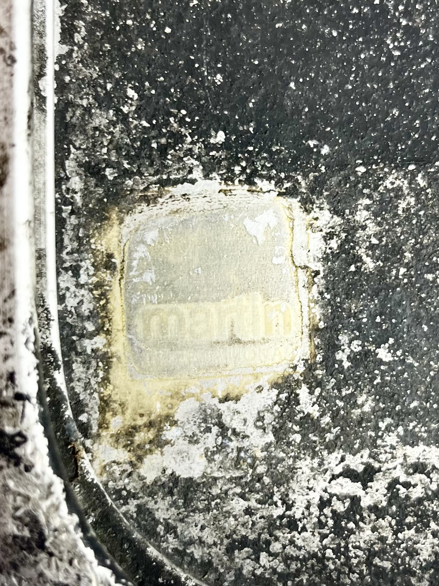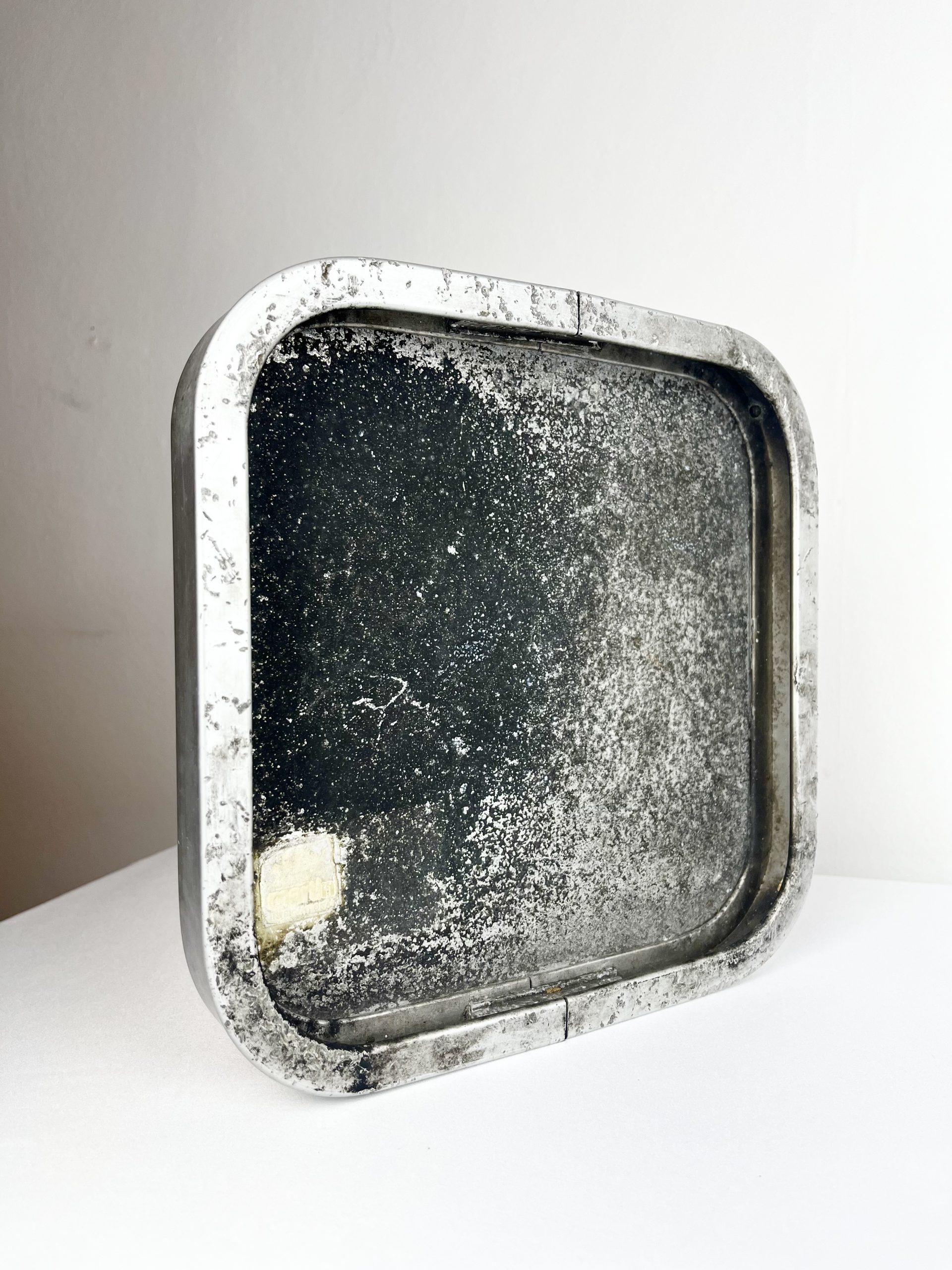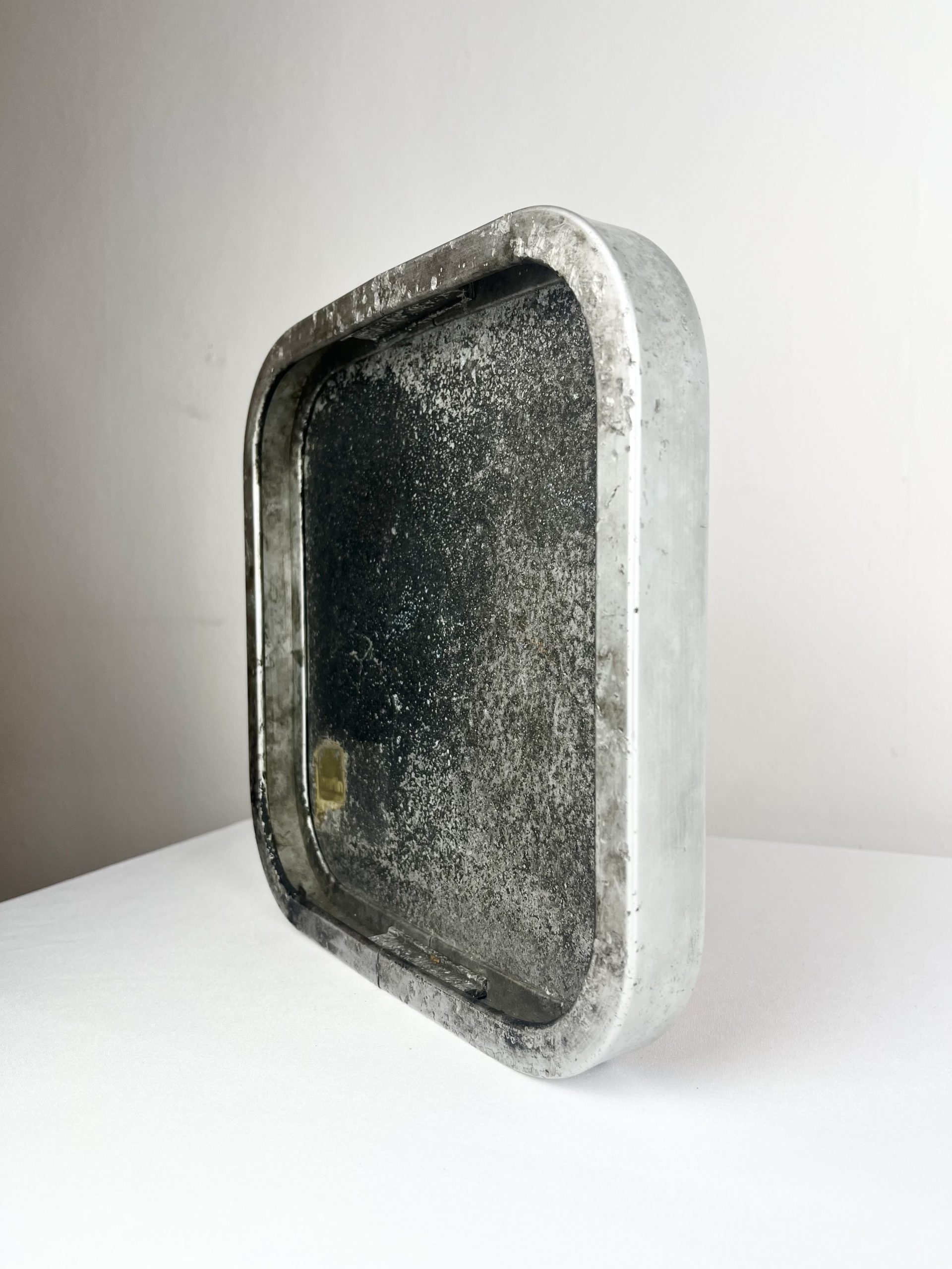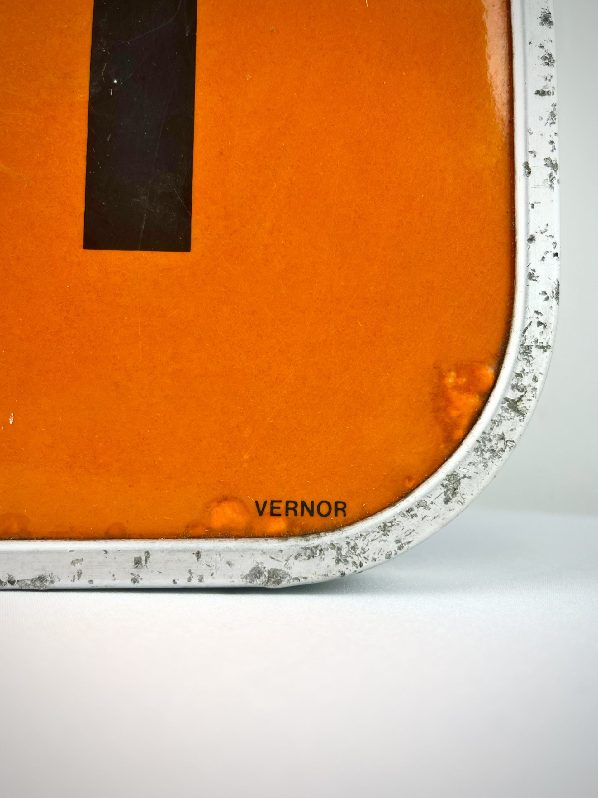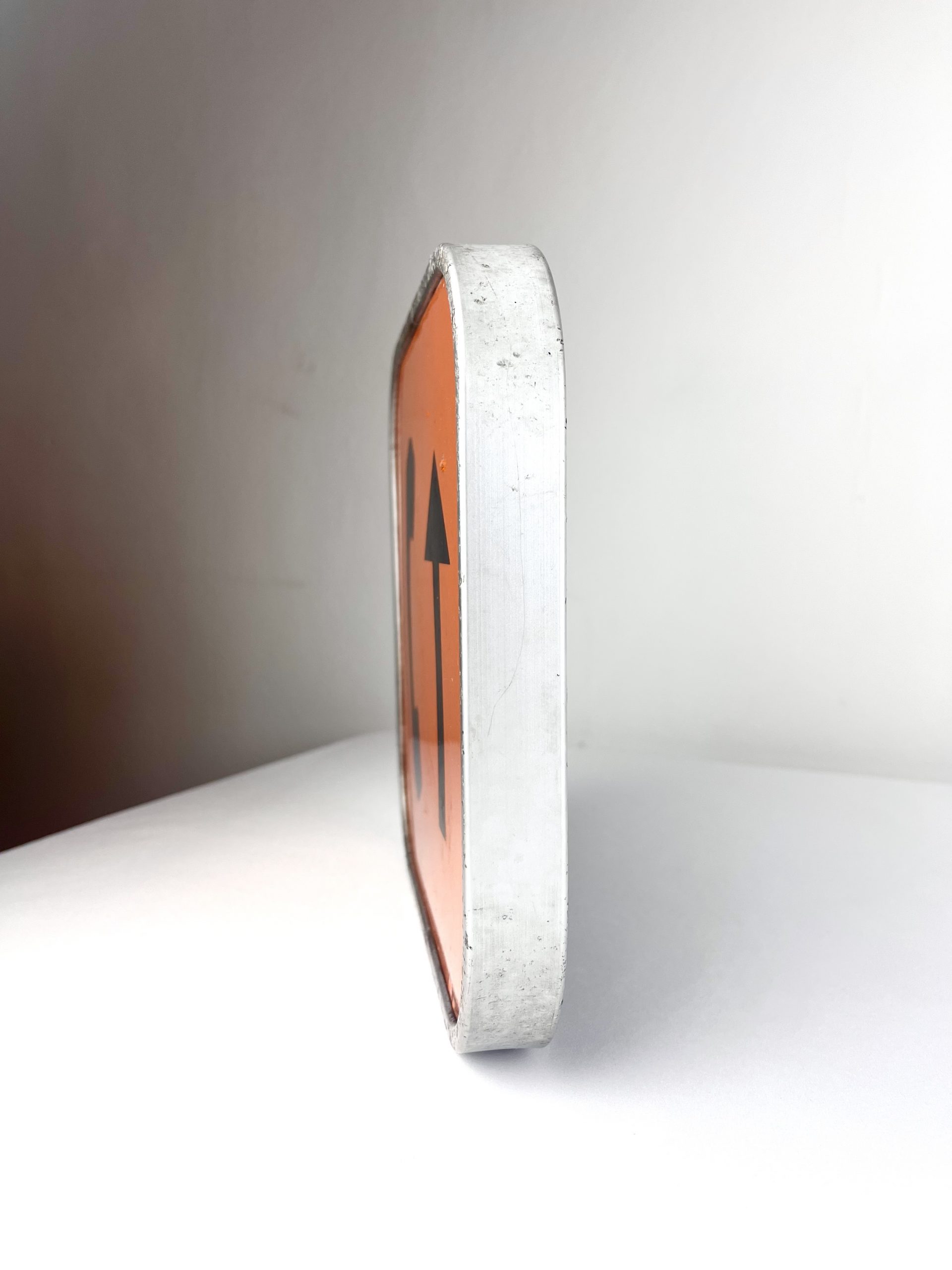 Orange enamelled metal in an aluminium frame, I believe it would have been used to indicate an emergency telephone point… but you’d have to ask the person who originally pinched it 😇